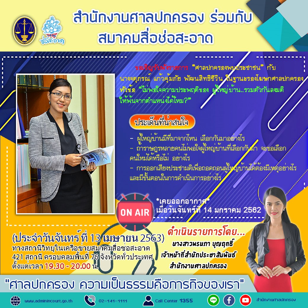 นางจตุภรณ์ แก้วคุ้มภัย พัฒนสิทธิชีวิน ตุลาการศาลปกครองกลาง ในฐานะรองโฆษกศาลปกครองในฐานะรองโฆษกศาลปกครอง หัวข้อ "ไม่พอใจความประพฤติของผู้ใหญ่บ้าน... รวมตัวกันลงมติให้พ้นจากตำแหน่งได้ไหม?"