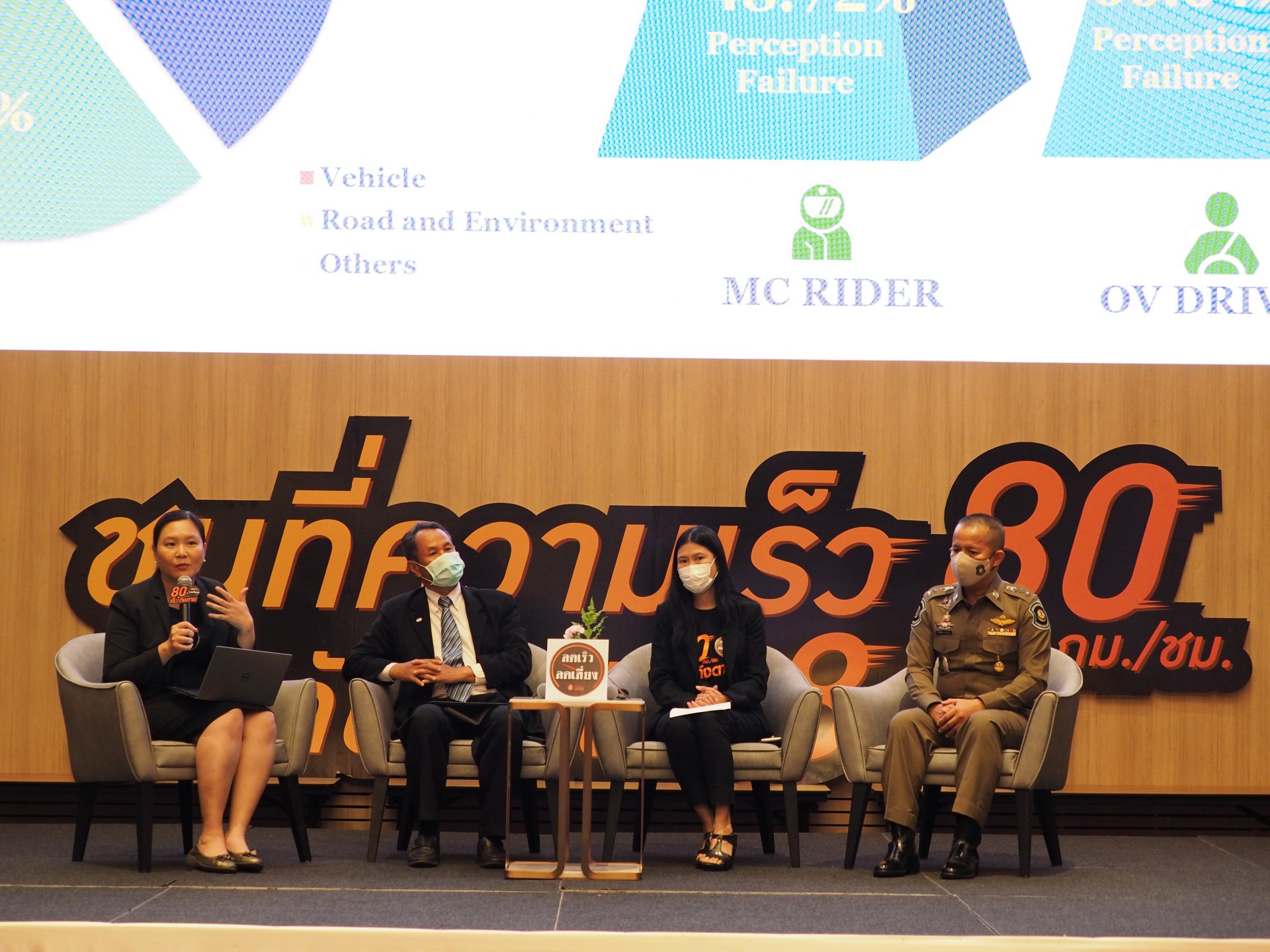นางสาวรุ่งอรุณ ลิ้มฬหะภัณ ผู้อำนวยการสำนักสนับสนุนการควบคุมปัจจัยเสี่ยงทางสังคม สสส. กล่าวว่า สสส. และภาคีเครือข่ายด้านความปลอดภัยทางถนน เห็นความสำคัญของปัญหาการเจ็บตายจากอุบัติเหตุทางถนน จึงร่วมกันสร้างความปลอดภัยทางถนนของประเทศไทยมากว่า 18 ปี โดยมุ่งเน้นการสนับสนุนกลไกการทำงานให้ทำงานได้อย่างมีประสิทธิภาพเกิดการบูรณาการกันในระดับจังหวัด อำเภอ และท้องถิ่น สนับสนุนงานวิชาการเพื่อขับเคลื่อนนโยบายและสังคม สื่อสารรณรงค์ประชาสัมพันธ์เพื่อกระตุ้นเตือนและสร้างความตระหนัก และปัจจุบันก็ให้ความสำคัญกับการแก้ไขปัญหาอุบัติเหตุที่เกิดจาก “รถจักรยานยนต์” ซึ่งเป็นสาเหตุการเกิดอุบัติเหตุร้อยละ 80 และ 2 ใน 3 ของการเสียชีวิตจากอุบัติเหตุทางถนนมีสาเหตุมาจาก “การขับรถเร็ว” การขับด้วยความเร็วสูงคนขับจะควบคุมรถหรือหลบหลีกอุบัติเหตุได้ยากขึ้น และเพิ่มความรุนแรงเมื่อเกิดอุบัติเหตุ จึงควรเว้นระยะห่างจากคันหน้าไม่ต่ำกว่า 60 เมตร เพื่อระยะการหยุดรถที่ปลอดภัย