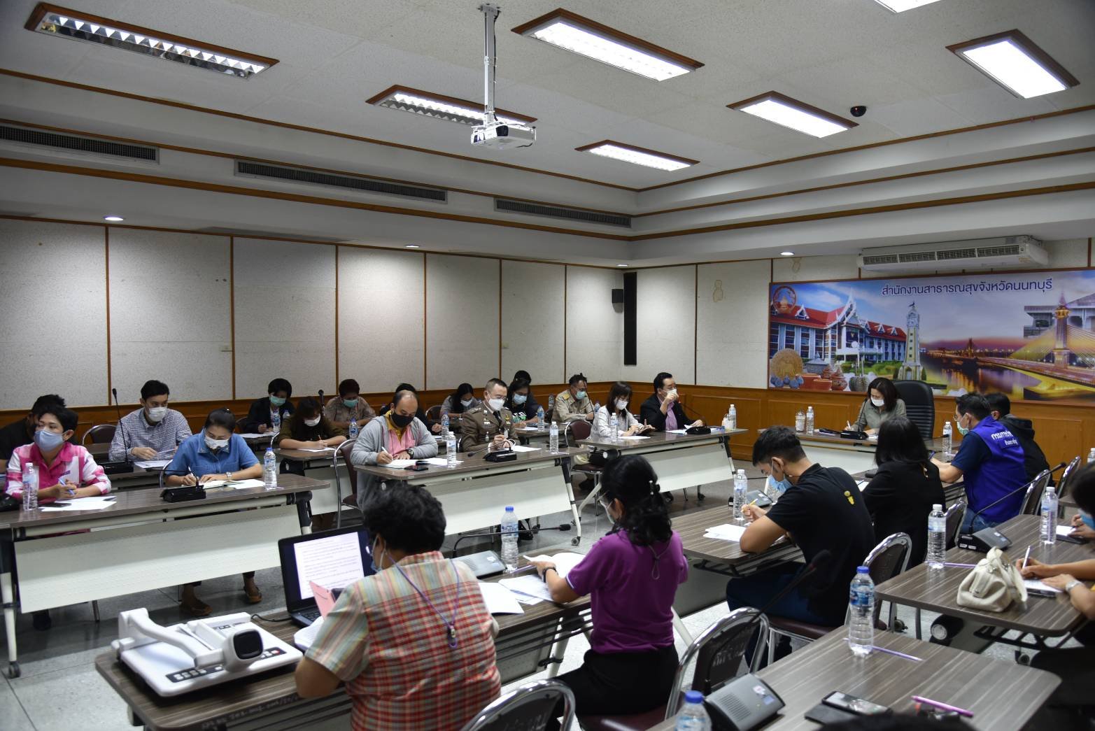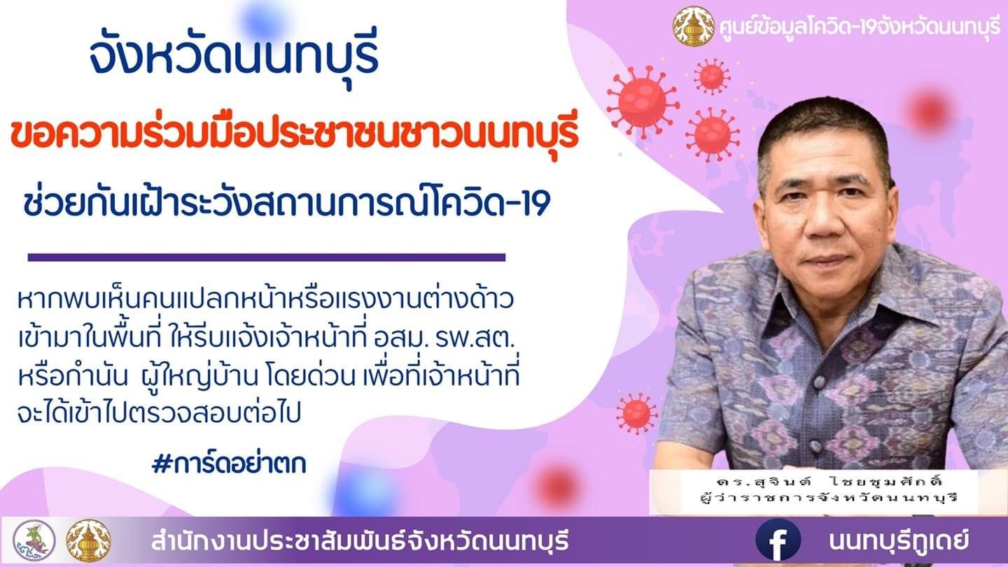 วันที่ 20 ธันวาคม 2563 เวลา 14.00 น. นายสุจินต์ ไชยชุมศักดิ์ ผู้ว่าราชการจังหวัดนนทบุรี มอบหมายให้ นางนิศากร วิศิษฏ์สรอรรถ รองผู้ว่าราชการจังหวัด เป็นประธานการประชุมเฝ้าระวังป้องกันและตรวจเชิงรุกโรคติดเชื้อไวรัสโคโรนาสายพันธุ์ใหม่ 2019 จังหวัดนนทบุรี พร้อมด้วยหัวหน้าส่วนราชการที่เกี่ยวข้อง ณ ห้องประชุม 1 สำนักงานสาธารณสุขจังหวัดนนทบุรี โดยที่ประชุมได้พิจารณามาตรการป้องกันควบคุมโรคติดเชื้อไวรัสโคโรนาสายพันธุ์ใหม่ 2019 เพื่อเป็นข้อมูลเสนอเข้าที่ประชุมคณะกรรมการโรคติดต่อจังหวัดนนทบุรี ได้แก่