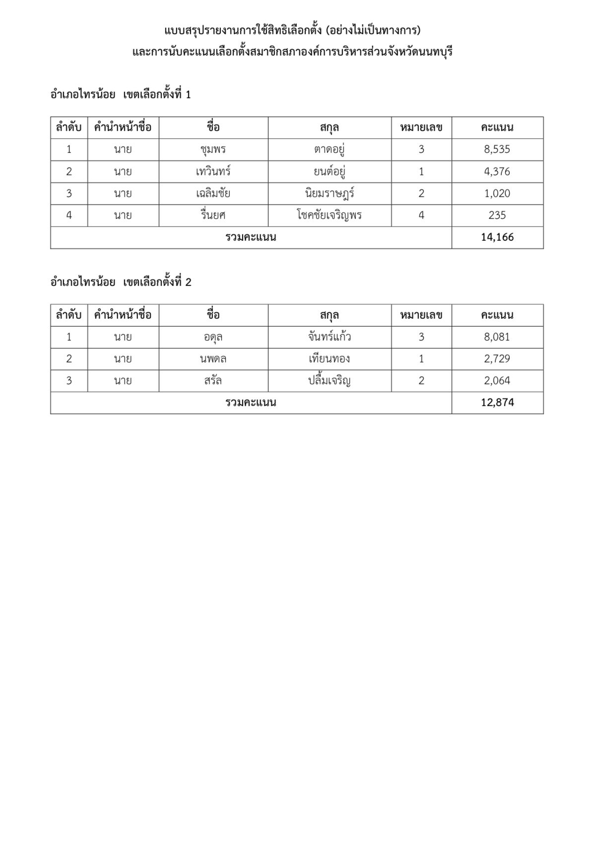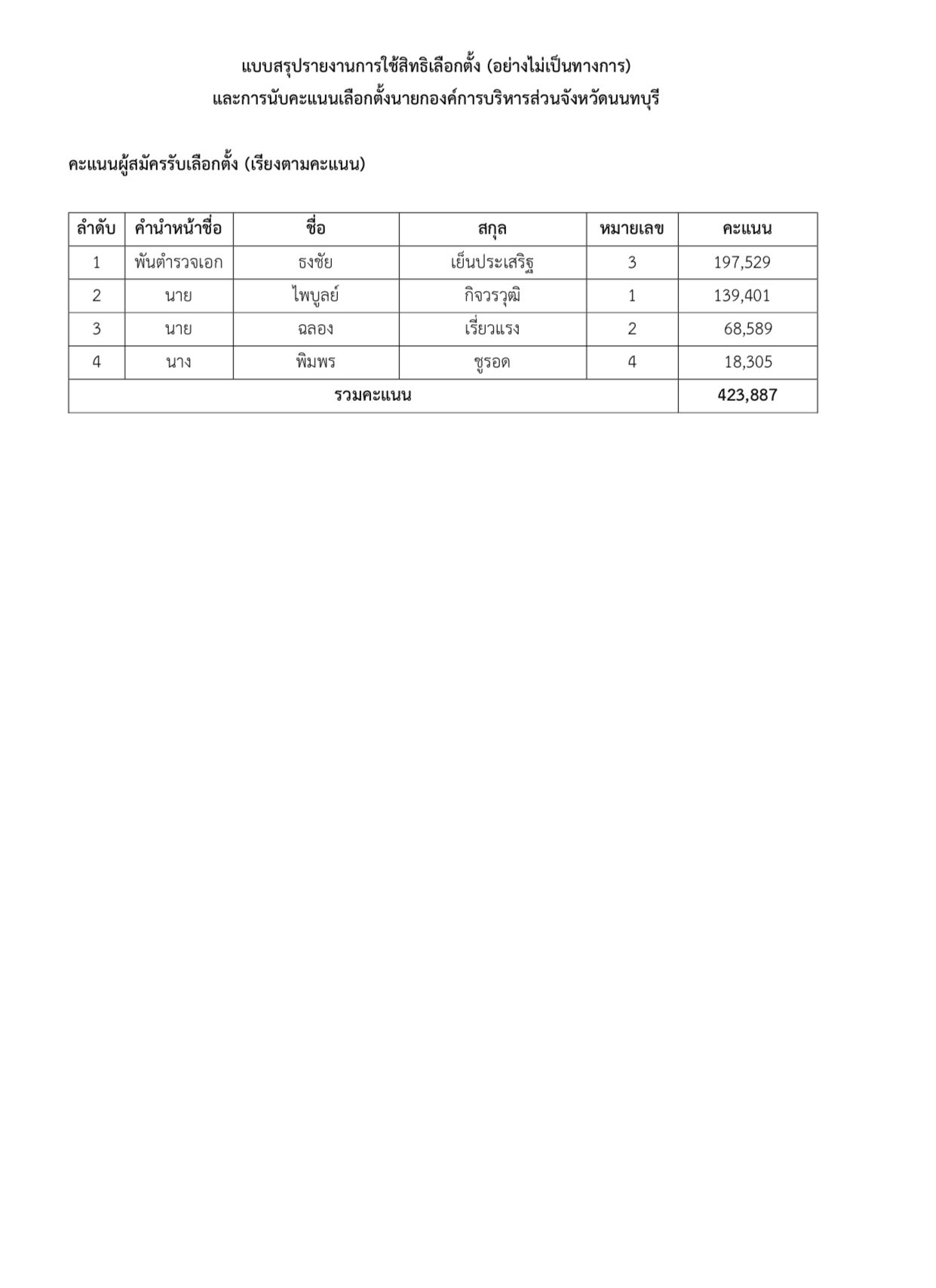 เผยผลคะแนนอย่างไม่เป็นทางการเลือกตั้งนายกองค์การบริหารส่วนจังหวัดนนทบุรี