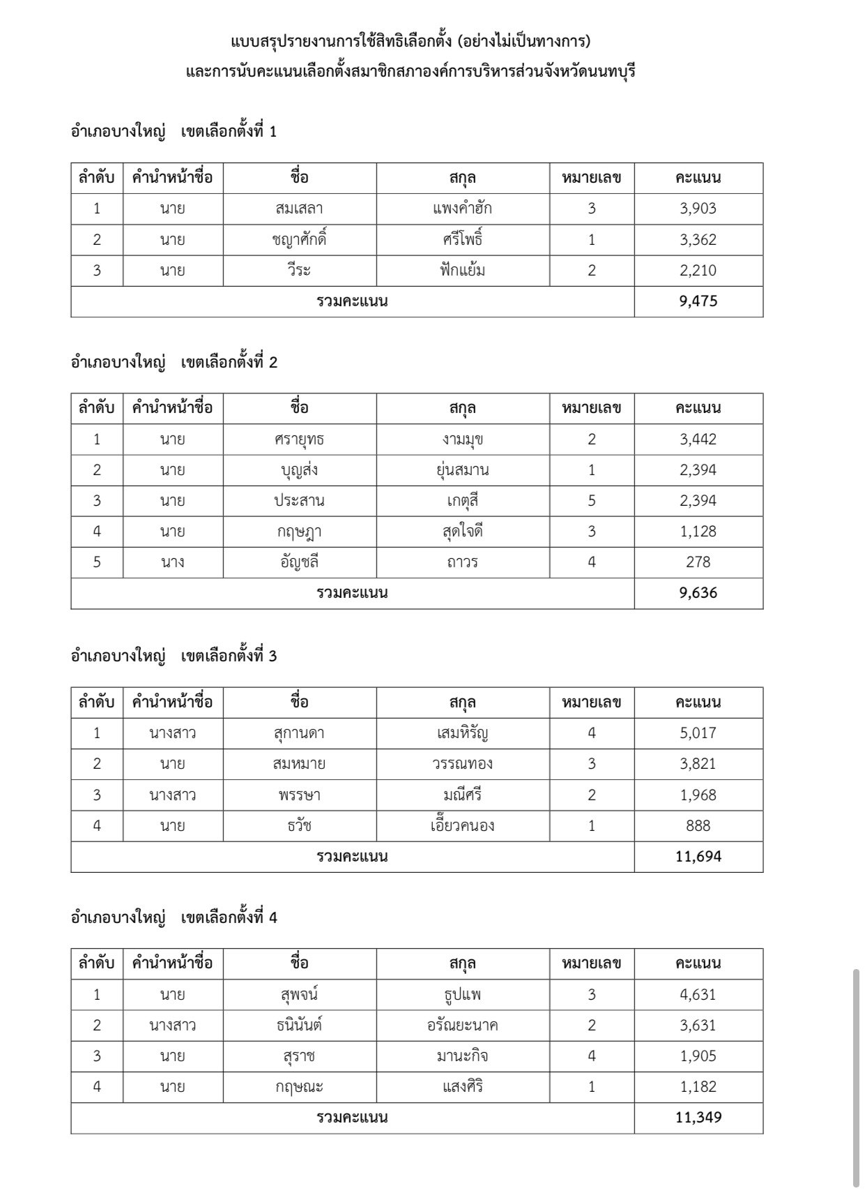 เผยผลคะแนนอย่างไม่เป็นทางการเลือกตั้งสมาชิกองค์การบริหารส่วนจังหวัดนนทบุรี