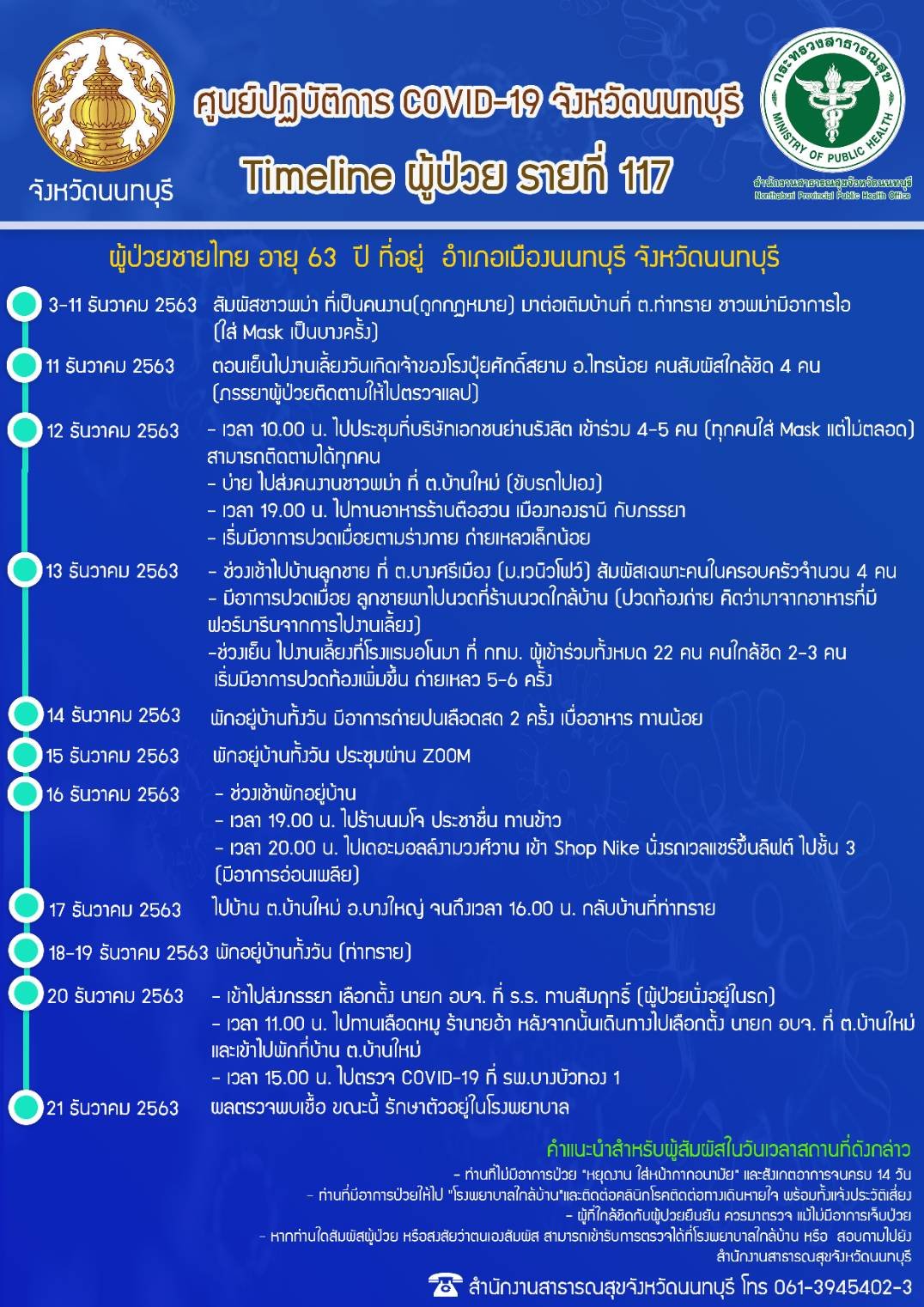 เมื่อวันที่ 22 ธันวาคม 2563 ศูนย์ปฏิบัติการ COVID-19 จังหวัดนนทบุรี โดย สำนักงานสาธารณสุขจังหวัดนนทบุรี เเจ้ง Timeline ผู้ป่วย รายที่ 117 (รายที่ 1 ของการระบาดรอบใหม่) จังหวัดนนทบุรี ผู้ป่วยเป็นชายไทย อายุ 63 ปี ที่อยู่ อำเภอเมืองนนทบุรี จังหวัดนนทบุรี พบผู้สัมผัสร่วมบ้าน 1 ราย (ภรรยา) ตรวจ Lab ให้ผลลบ ผู้สัมผัสใกล้ชิด (High Risk) จำนวน 15 คน ติดตามได้ครบทุกคน ตรวจ Lab 22 ธันวาคม 2563 ผู้สัมผัสเสี่ยงต่ำ (Low Risk) อยู่ระหว่างการติดตามโดย สสอ.เมืองนนทบุรี สสอ.บางใหญ่ และ กรุงเทพมหานคร