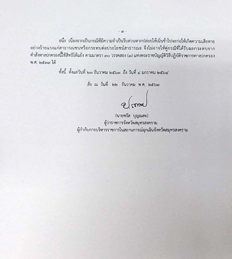 นอกจากนี้ นายชรัส บุญณสะ ผู้ว่าราชการจังหวัดสมุทรสงคราม มีคำสั่งปิดสถานที่เสี่ยงต่อการแพร่ระบาดของโรคติดต่ออันตราย 13 วัน ตั้งแต่วันที่ 23 ธันวาคม 2563 - 4 มกราคม 2564 โดยมีผลให้ปิด 28 สถานที่ เช่น สถานบริการ สถานที่เล่นพนันชนไก่และกัดปลา โรงภาพยนตร์ คาราโอเกะ ศูนย์พัฒนาเด็กเล็ก สถานศึกษาทุกแห่ง สถาบันกวดวิชา ฟิตเนส สปา ห้างสรรพสินค้า ยกเว้นแผนกซูเปอร์มาร์เก็ต แผนกขายยา แผนกอาหาร ปิดตลาด หรือตลาดนัด ยกเว้นที่จำหน่ายอาหาร เวชภัณฑ์ ส่วนร้านอาหาร ร้านกาแฟ ให้ซื้อกลับบ้าน