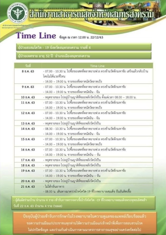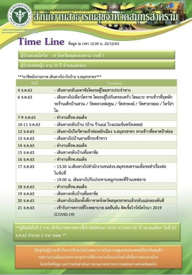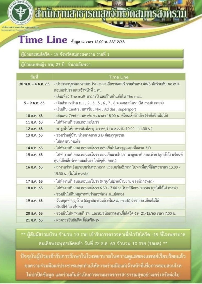 ผู้ป่วยหญิง อายุ 27 ปี อยู่ที่ อ.อัมพวา และทำงานที่ อบต.ดอนมะโนรา พบประวัติเดินห้างสรรพสินค้า The mall บางกะปิ, Central มหาชัย, ร่วมประชุมในโรงแรม, กินหมูกะทะที่ร้าน