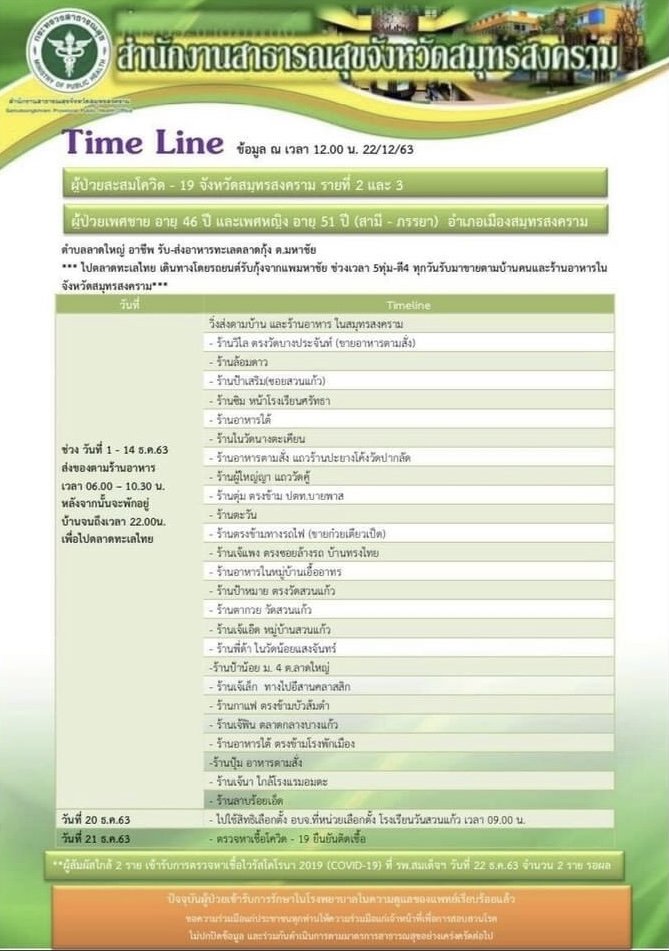ผู้ป่วยชายอายุ 46 ปี และหญิงอายุ 51 ปี สามีภรรยา อยู่ที่ อ.เมืองสมุทรสงคราม อาชีพรับส่งอาหารทะเลตลาดกุ้ง ต.มหาชัย พบประวัติเดินทางโดยรถยนต์รับกุ้งจากแพมหาชัย ช่วงเวลา 23.00-04.00 น. ของทุกวัน เพื่อขายตามบ้านและร้านอาหารใน จ.สมุทรสงคราม