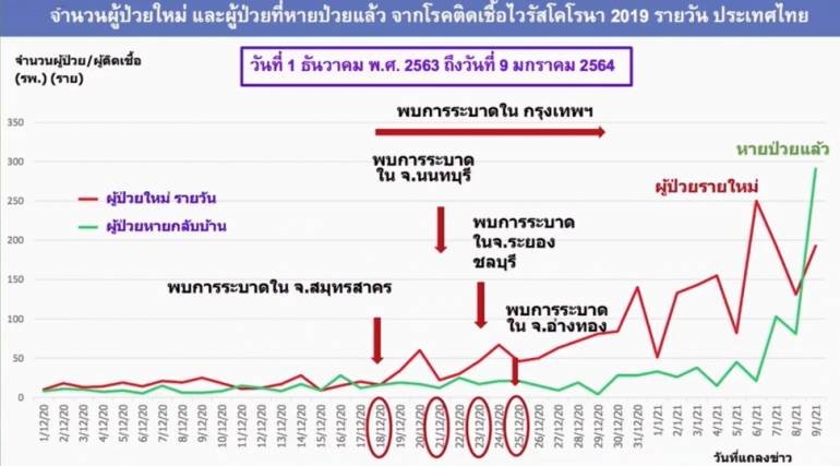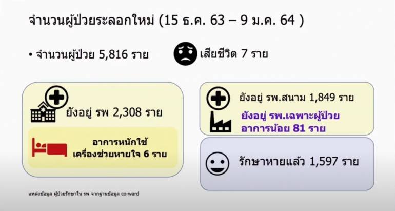 เมื่อวันที่ 9 มกราคม 2564 นพ.โอภาส การย์กวินพงศ์ อธิบดีกรมควบคุมโรค แถลงสถานการณ์ COVID-19 ระบุว่า การระบาดระลอกใหม่ ตั้งแต่วันที่ 15 ธันวาคม 2563 - วันที่ 9 มกราคม 2564 รวมสะสม 5,816 คน เสียชีวิต 7 คน โดยยังอยู่ในโรงพยาบาล 2,308 คน อาการหนักใช้เครื่องช่วยหายใจ 6 คน และยังอยู่ในโรงพยาบาลสนาม 1,849 คน ส่วนอยู่ในโรงพยาบาลแต่มีอาการน้อย 81 คน รักษาหายแล้ว 1,597 คน