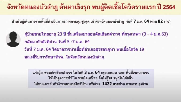 นพ.จักรรัฐ พิทยาวงศ์อานนท์ ผู้อำนวยการกองระบาดวิทยา ระบุว่า จ.หนองบัวลำภู มีการค้นหาเชิงรุก พบผู้ติดเชื้อ COVID-19 คนแรกของจังหวัด ในปี 2564 เป็นผู้ป่วยชาย อายุ 23 ปี ขึ้นเครื่องบินมาสอบคัดเลือกตำรวจที่ กทม. วันที่ 3-4 มกราคม 2564 กลับมากักตัวที่บ้าน วันที่ 5-7 มกราคม 2564 วันที่ 7 มกราคม 2564 ได้มาตรวจหาเชื้อที่ อ.สุวรรณคูหา พบเชื้อ COVID-19 ขณะนี้รับการรักษาที่โรงพยาบาลใน จ.หนองบัวลำภู