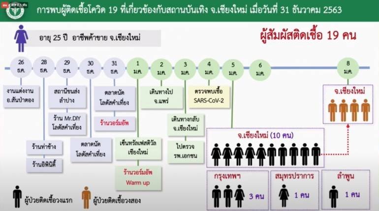 ส่วนกรณีการแพร่ระบาดในสถานบันเทิงที่ จ.เชียงใหม่ หลังพบผู้ติดเชื้อวัย 25 ปี อาชีพค้าขาย พบประวัติเดินทางไปตลาด ห้างสรรพสินค้า และสถานบันเทิงหลายแห่ง และร้าน Warm up ที่มีคนใช้บริการจำนวนมาก และมีการแพร่ระบาดของโรคค่อนข้างมาก
