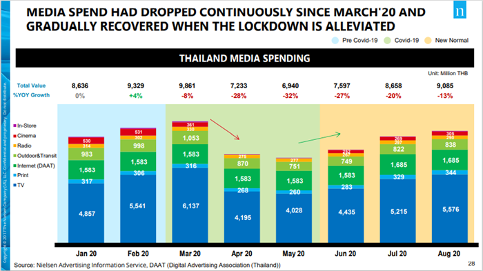 ผลกระทบของโควิด-19 ได้ฉุดให้มีการใช้เม็ดเงินโฆษณาลดลงอย่างต่อเนื่องมานับตั้งแต่เดือนมีนาคม 63 ที่มีการใช้เงินโฆษณา 9,861 ล้านบาท ลดลง 8% เมื่อเทียบกับช่วงเดียวกันของปีก่อน, เดือนเมษายน 63 มีการใช้เม็ดเงินโฆษณา 7,233 ล้านบาท ลดลงจากช่วงเดียวกันของปีก่อน 28% , เดือนพฤษภาคม 63 มีการใช้เม็ดเงินโฆษณา 6,940 ล้านบาท ลดลง 32% , เดือนมิถุนายน 63 มีการใช้เม็ดเงินโฆษณา 7,597 ล้านบาท ลดลง 27% , เดือนกรกฎาคม 63 มีการใช้เม็ดเงินโฆษณา 8,658 ล้านบาท ลดลง 20% , เดือนสิงหาคม 63 มีการใช้เม็ดเงินโฆษณา 9,085 ล้านบาท ลดลง 13%