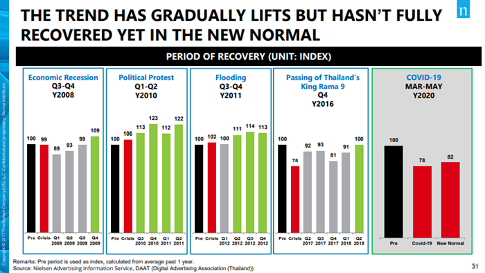 “ช่วงต้มยำกุ้ง เม็ดเงินโฆษณาลดลงไม่เยอะมาก น้ำท่วม และการประท้วงไม่ได้รับผลกระทบ ช่วงเสด็จสวรรคตของ ร.9 ทางภาครัฐขอให้หยุดโฆษณาช่วงนึง ไม่ได้เกิดจากแบรนด์ไม่มีเงิน แต่โควิด-19 ทุกแบรนด์ระมัดระวังการใช้เงิน ส่งผลให้เงินโฆษณาลดลงไป 22%” รัญชิตา ศรีวรวิไล ผู้อำนวยการ บริษัท นีลเส็น มีเดีย ประเทศไทย อธิบาย พร้อมเสริม