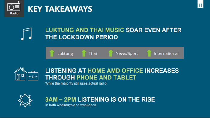 สื่อวิทยุ เป็นสื่อที่น่าจับตามอง เนื่องจากมีคนฟังมากขึ้นในช่วงการระบาด โดยประเภทที่มีผู้ฟังเพิ่มขึ้นตั้งแต่เมษายนที่ผ่านมากระทั่งปัจจุบัน ได้แก่ คือ เพลงลูกทุ่ง-เพลงไทย , ข่าว/กีฬา และเพลงสากล โดยสิ่งที่น่าสังเกต คือ พฤติกรรมของคนฟังวิทยุเพื่อเป็นเพื่อน และผ่านอุปกรณ์อย่างโทรศัพท์มือถือ รวมไปถึงแท็บเล็ต และช่วงเวลาที่ฟังวิทยุมากขึ้นเป็นช่วงเวลา 8.00-14.00 น. ทั้งวันธรรมดาและเสาร์อาทิตย์