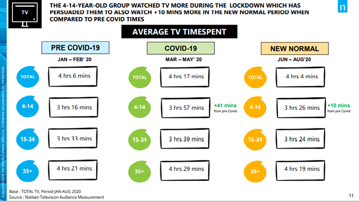 สื่อทีวี ในช่วงที่เกิดการระบาดหนักของโควิด-19 ผู้ชมทีวีในทุกกลุ่มอายุใช้เวลาในการดูทีวีนานขึ้น แต่ที่น่าสนใจคือผู้ชมในกลุ่มอายุ 4-14 ปี มีการเข้ามาดูทีวีเพิ่มขึ้น และใช้ระยะเวลาในการดูทีวีเพิ่มขึ้นเฉลี่ย 40 นาทีต่อวัน อยู่ที่ 3 ชั่วโมง 57 นาที เทียบกับเมื่อช่วงก่อนการระบาด ส่วนเนื้อหาหรือคอนเทนต์ในการรับชมทีวีที่คนนิยม ได้แก่ ข่าว , ละคร/มินิซีรีย์ , ฟีเจอร์ฟิล์ม ไลท์เอนเตอร์เทนเมนต์ และซีรีย์ต่างประเทศ