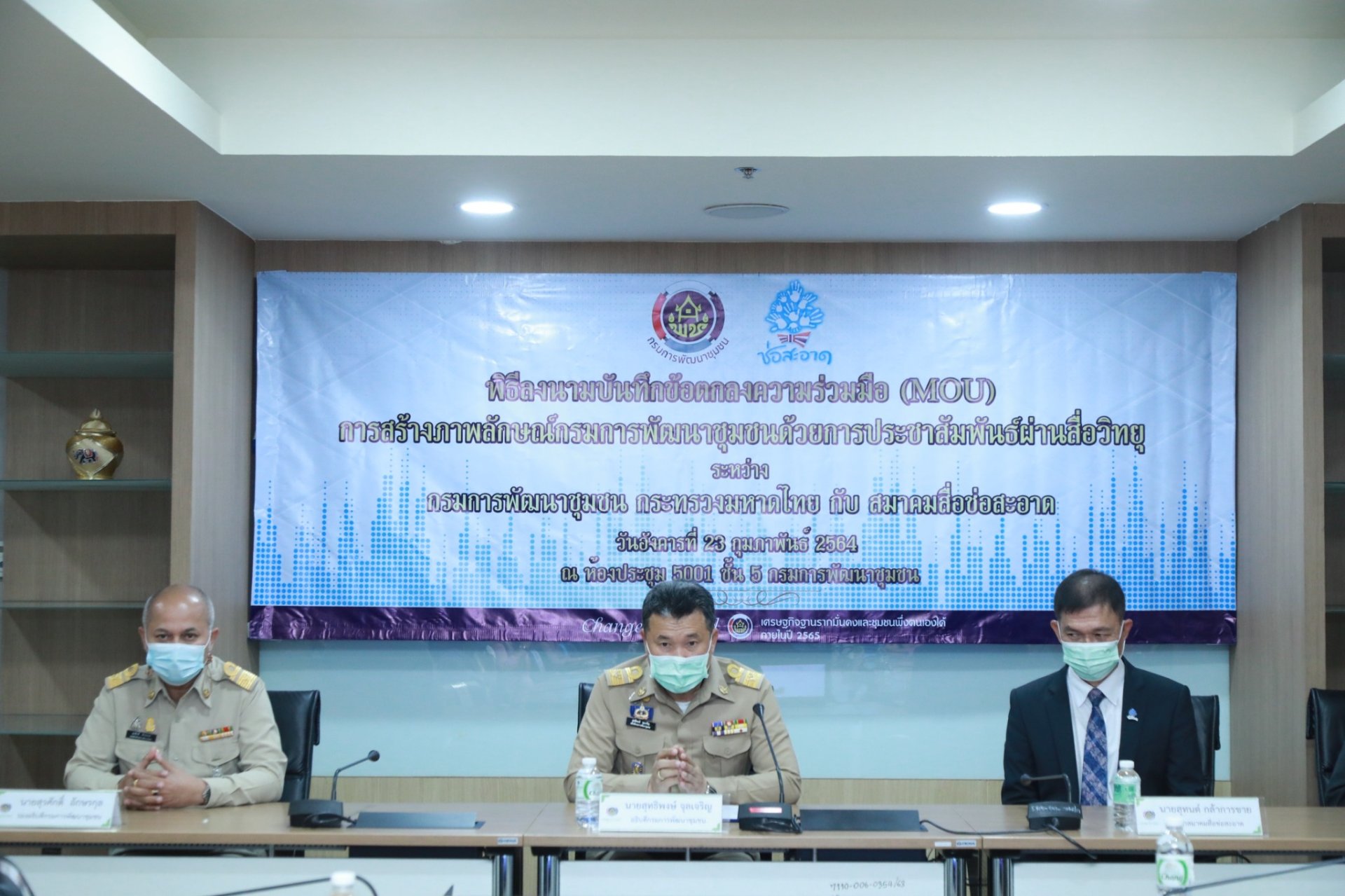 วันอังคารที่ 23 กุมภาพันธ์ 2564 เวลา 10.30 น. นายสุทธิพงษ์ จุลเจริญ อธิบดีกรมการพัฒนาชุมชน กระทรวงมหาดไทย และสมาคมสื่อช่อสะอาด โดยนายสุทนต์ กล้าการขาย นายกสมาคมสื่อช่อสะอาด ร่วมลงนามบันทึกข้อตกลงความร่วมมือ การประชาสัมพันธ์ภารกิจกรมการพัฒนาชุมชนผ่านสื่อวิทยุ ในการนี้ นายสุรศักดิ์ อักษรกุล รองอธิบดีกรมการพัฒนาชุมชน นางสาวญาณินท์ เรืองศิริ เหรัญญิกนายกสมาคมสื่อช่อสะอาด นางสาวนงลักษณ์ ตันประทุมวงษ์ กรรมการสมาคมสื่อช่อสะอาด คณะผู้บริหารกรมการพัฒนาชุมชน เจ้าหน้าที่กรมการพัฒนาชุมชน เจ้าหน้าที่สมาคมสื่อช่อสะอาด และสื่อมวลชน ร่วมเป็นเกียรติและสักขีพยานฯ โดยมีนายสุธีธ์ มั่งมี เลขานุการกรม กรมการพัฒนาชุมชน กล่าวรายงานวัตถุประสงค์ของการลงนาม MOU ในครั้งนี้ ณ ห้องประชุม 5001 ชั้น 5 กรมการพัฒนาชุมชน ศูนย์ราชการเฉลิมพระเกียรติ 80 พรรษา 5 ธันวาคม 2550 ถนนแจ้งวัฒนะ กรุงเทพมหานคร