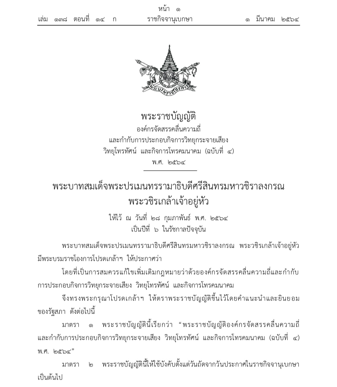 เมื่อวันที่ 1 มีนาคม 2564 ราชกิจจานุเบกษาเผยแพร่พระราชบัญญัติองค์กรจัดสรรคลื่นความถี่และกำกับการประกอบกิจการวิทยุกระจายเสียง วิทยุโทรทัศน์ และกิจการโทรคมนาคม (ฉบับที่ 4) พ.ศ.2564 โดย พ.ร.บ. ดังกล่าวให้มีผลบังคับใช้ตั้งแต่วันถัดจากวันที่ประกาศในราชกิจจานุเบกษาเป็นต้นไป และสำนักงานเลขาธิการวุฒิสภาเริ่มดำเนินการจัดให้มีการสรรหากรรมการ กสทช. ภายใน 15 วันนับตั้งแต่พ.ร.บ.บังคับใช้