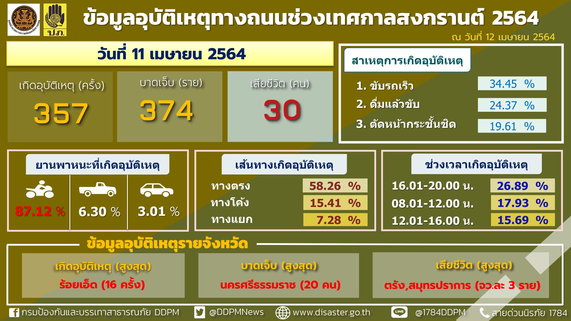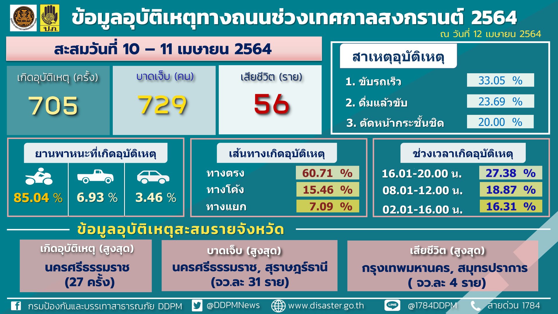 วันที่ 12 เมษายน 2564 เวลา 10.30 น. ที่กรมป้องกันและบรรเทาสาธารณภัย ศูนย์อำนวยการป้องกันและลดอุบัติเหตุทางถนนช่วงเทศกาลสงกรานต์ พ.ศ.2564 สรุปสถิติอุบัติเหตุทางถนนประจำวันที่ 11 เมษายน 2564 เกิดอุบัติเหตุ 357 ครั้ง ผู้เสียชีวิต 30 ราย ผู้บาดเจ็บ 374 คน สรุปอุบัติเหตุทางถนนสะสมในช่วง 2 วันของการรณรงค์ (10 - 11 เมษายน 2564) เกิดอุบัติเหตุรวม 705 ครั้ง ผู้เสียชีวิตรวม 56 ราย ผู้บาดเจ็บรวม 729 คน จังหวัดที่ไม่มีผู้เสียชีวิต (ตายเป็นศูนย์) มี 40 จังหวัด ซึ่งรถจักรยานยนต์เป็นยานพาหนะที่ เกิดอุบัติเหตุสูงสุด ขณะที่ผู้ที่มีอายุ 50 ปีขึ้นไปเป็นกลุ่มที่มีการบาดเจ็บและเสียชีวิตสูงสุด ประสานจังหวัดคุมเข้มปัจจัยเสี่ยงอุบัติเหตุทางถนนบนเส้นทางสายรอง เส้นทางเชื่อมต่อระหว่างจังหวัด ถนน อบต.และหมู่บ้าน ปรับแผนการจัดตั้งจุดตรวจ ด่านตรวจ และด่านชุมชนให้สอดคล้องกับสถานการณ์อุบัติเหตุ โดยเพิ่มความเข้มข้นในการเรียกตรวจความพร้อมทั้งคนและรถโดยเฉพาะผู้ใช้รถจักยานยนต์ที่มีพฤติกรรมเสี่ยงดื่มแล้วขับและตรวจความพร้อมของผู้ขับขี่ที่มีอายุ 50 ปีขึ้นไป การคาดเข็มขัดนิรภัยและสวมหมวกนิรภัย อีกทั้งร่วมสืบสานประเพณีสงกรานต์ด้วยการรดริน พรมน้ำ และไม่สาดน้ำใส่กัน เพื่อให้ทุกการเดินทางในช่วงเทศกาลสงกรานต์มีความปลอดภัยและห่างไกลจากโควิด – 19