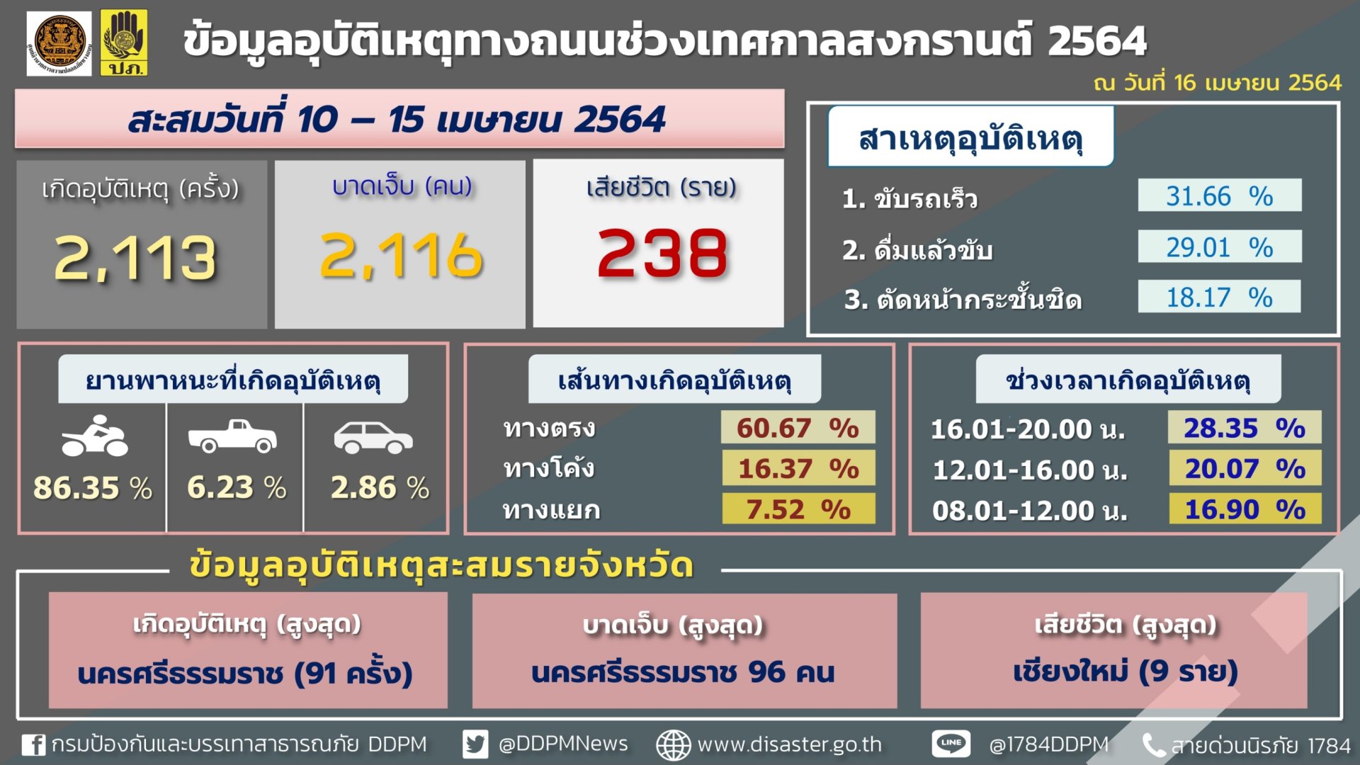 วันที่ 16 เมาายน 2564 เวลา 10.30 น. ที่กรมป้องกันและบรรเทาสาธารณภัย ศูนย์อำนวยการป้องกันและลดอุบัติเหตุทางถนน ช่วงเทศกาลสงกรานต์ พ.ศ.2564 สรุปสถิติอุบัติเหตุทางถนนประจำวันที่ 15 เมษายน 2564 เกิดอุบัติเหตุ 313 ครั้ง ผู้เสียชีวิต 29 ราย ผู้บาดเจ็บ 310 คน สรุปอุบัติเหตุทางถนนสะสมในช่วง 6 วันของการรณรงค์ (10 - 15 เมษายน 2564) เกิดอุบัติเหตุรวม 2,113 ครั้ง ผู้เสียชีวิตรวม 238 ราย ผู้บาดเจ็บ รวม 2,116 คน จังหวัดที่ไม่มีผู้เสียชีวิต (ตายเป็นศูนย์) มี 8 จังหวัด ประสานจังหวัดเพิ่มความเข้มข้นดูแลเส้นทางขากลับกรุงเทพฯ และเส้นทางที่มุ่งสู่จังหวัดใหญ่ เน้นการจัดตั้งจุดตรวจในเส้นทางเสี่ยงอุบัติเหตุ โดยเฉพาะเส้นทางตรงที่มีระยะทางไกล และจุดที่เกิดอุบัติเหตุบ่อยครั้ง กวดขันพฤติกรรมเสี่ยงขับรถเร็ว ดื่มแล้วขับ และไม่ใช้อุปกรณ์นิรภัย รวมถึงประเมินความพร้อมของผู้ขับรถ อีกทั้งจัดเจ้าหน้าที่อำนวยความสะดวก และจัดระบบการจราจรให้สอดคล้องกับปริมาณรถในแต่ละเส้นทาง