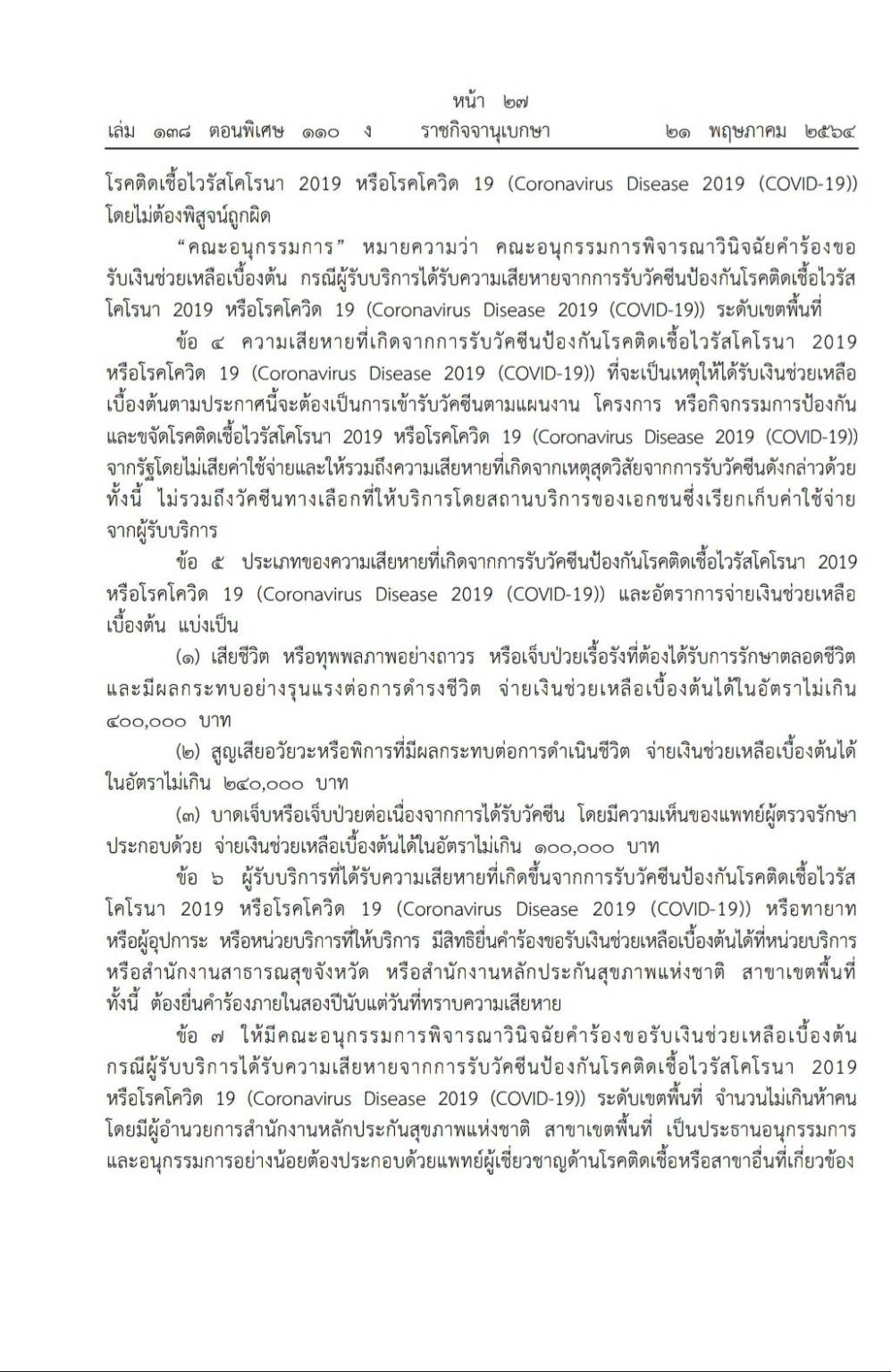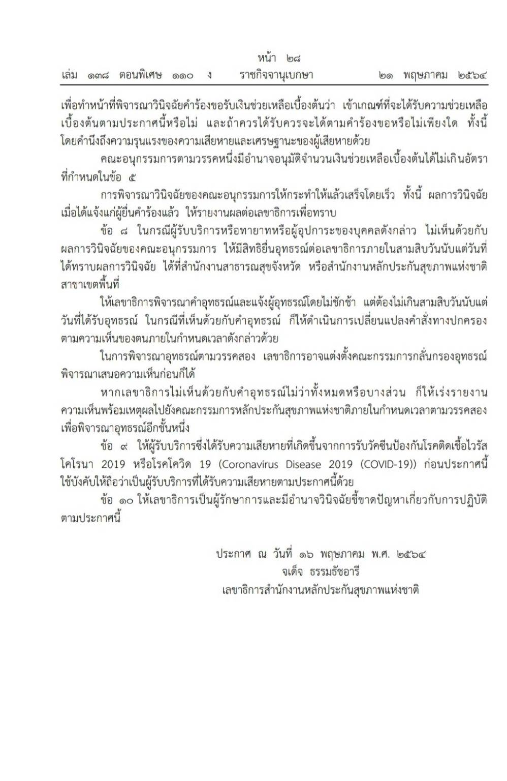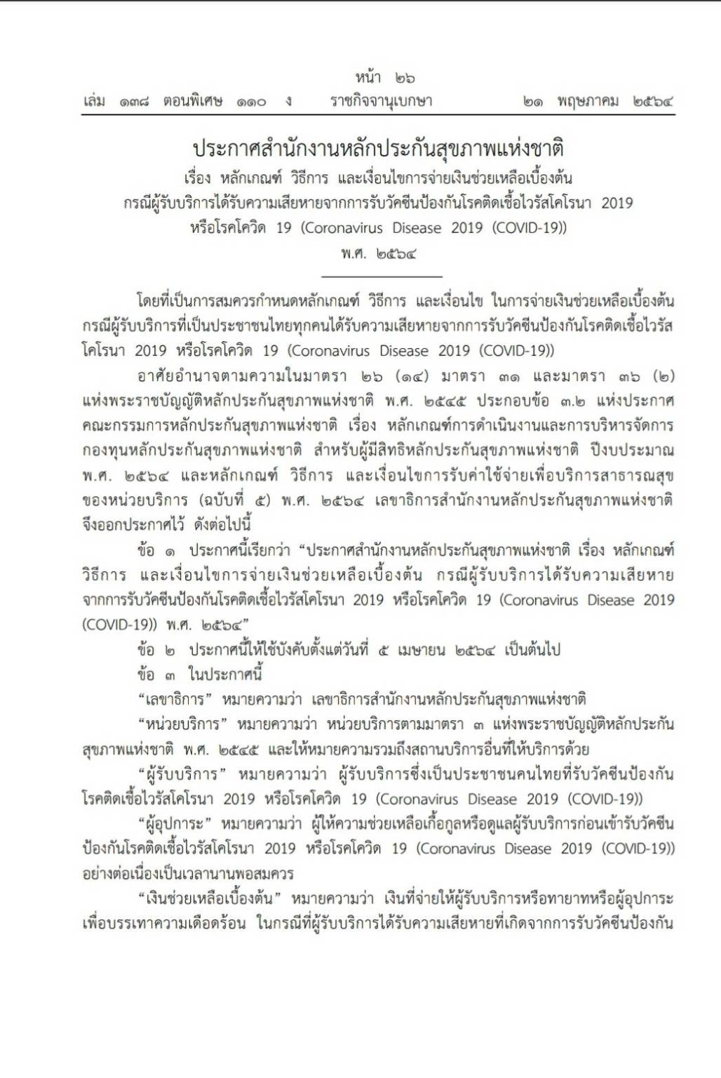 ราชกิจจานุเบกษาเผยแพร่ประกาศสำนักงานหลักประกันสุขภาพแห่งชาติ เรื่อง หลักเกณฑ์ วิธีการ และเงื่อนไขการจ่ายเงินช่วยเหลือเบื้องต้น กรณีผู้รับบริการได้รับความเสียหายจากการรับวัคซีนป้องกันโรคติดเชื้อไวรัสโคโรนา 2019 หรือโรคโควิด-19 (Coronavirus Disease 2019 : COVID-19) พ.ศ. 2564
