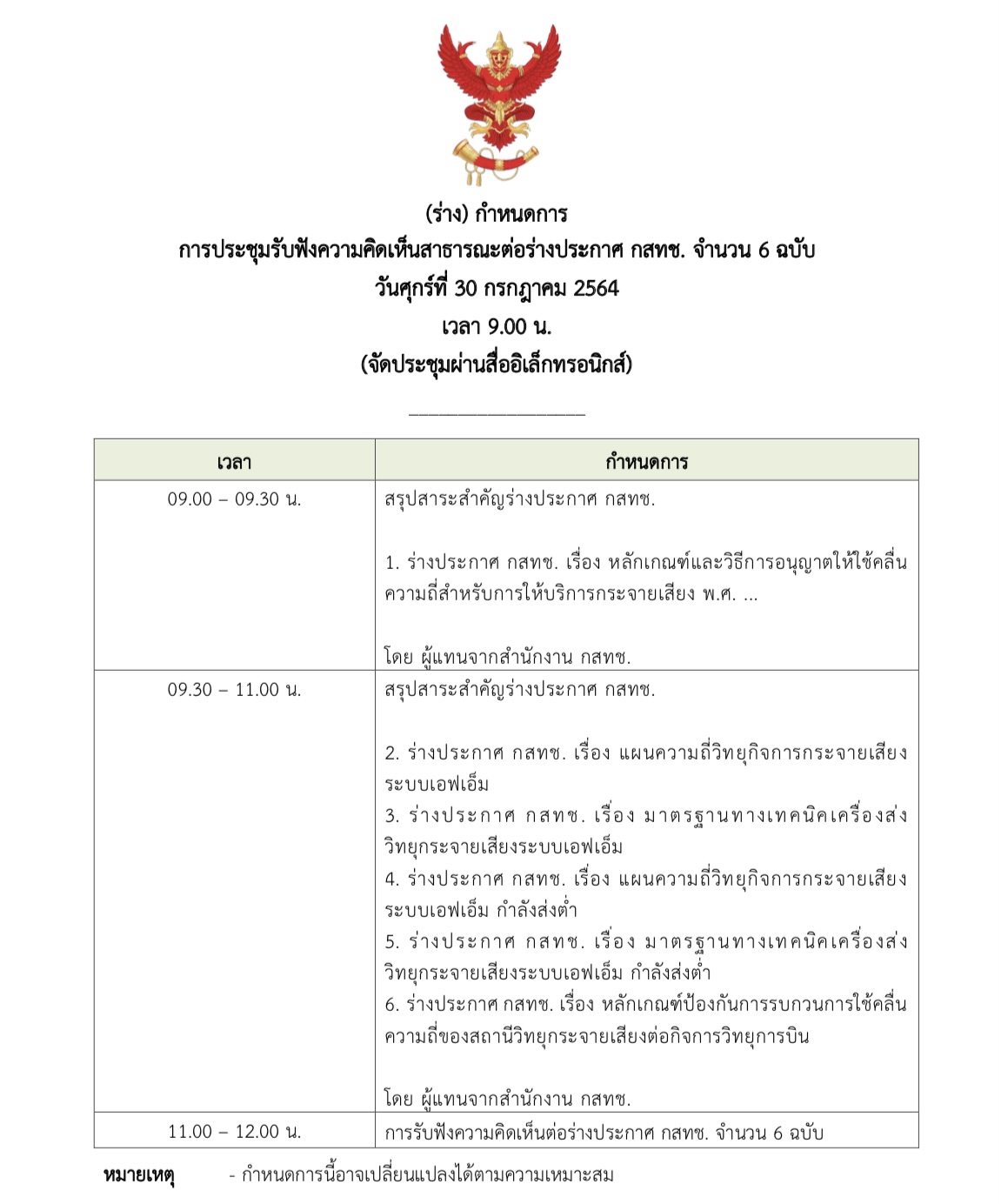 ในการนี้ สำนักงาน กสทช. จะจัดให้มีการประชุมรับฟังความคิดเห็นสาธารณะต่อร่างประกาศ กสทช. จำนวน 6 ฉบับดังกล่าว ในวันศุกร์ที่ 30 กรกฎาคม 2564 ตั้งแต่เวลา 9.00 น. เป็นต้นไป โดยมีความจำเป็นต้องปรับรูปแบบการจัดประชุมเป็นการประชุมผ่านสื่ออิเล็กทรอนิกส์เท่านั้น เนื่องจากสถานการณ์การแพร่ระบาดของโรคติดเชื้อไวรัสโคโรนา 2019 (COVID-19)