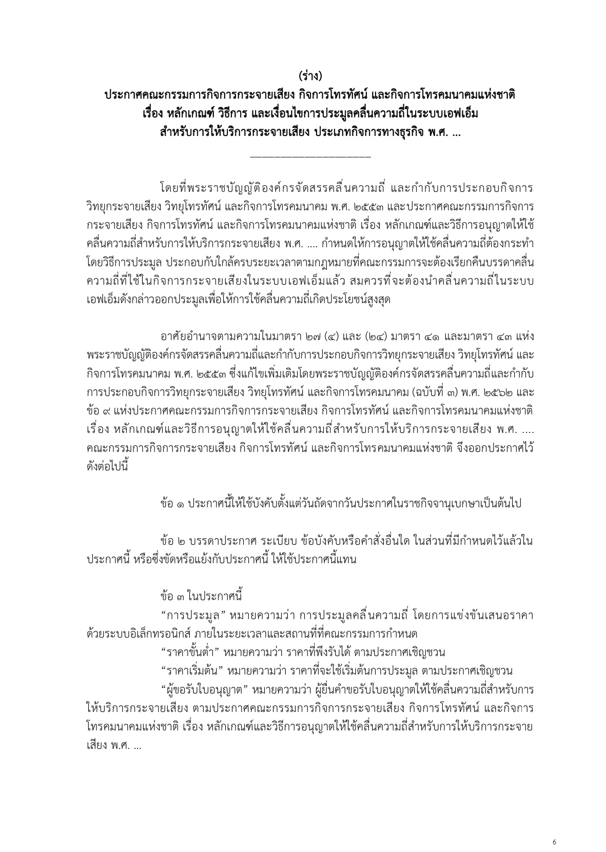 ตามที่ที่ประชุม กสทช. ครั้งที่ 19/2564 เมื่อวันพุธที่ 6 ตุลาคม 2564 ได้มีมติเห็นชอบในหลักการร่างประกาศ กสทช. เรื่อง หลักเกณฑ์ วิธีการ และเงื่อนไขการประมูลคลื่นความถี่ในระบบเอฟเอ็ม สำหรับการให้บริการกระจายเสียง ประเภทกิจการทางธุรกิจ พ.ศ. ... (ร่างประกาศ) พร้อมทั้งมอบหมายให้สำนักงาน กสทช. นำร่างประกาศไปรับฟังความคิดเห็นสาธารณะตามมาตรา 28 แห่งพระราชบัญญัติองค์กรจัดสรรคลื่นความถี่และกำกับการประกอบกิจการวิทยุกระจายเสียง วิทยุโทรทัศน์ และกิจการโทรคมนาคม พ.ศ. 2553
