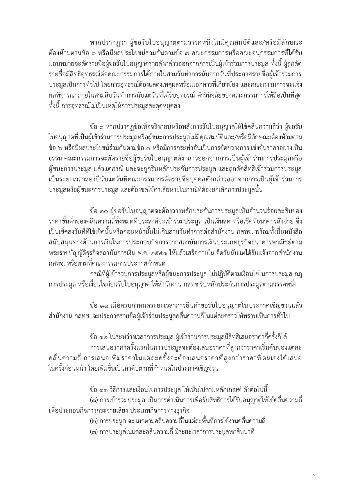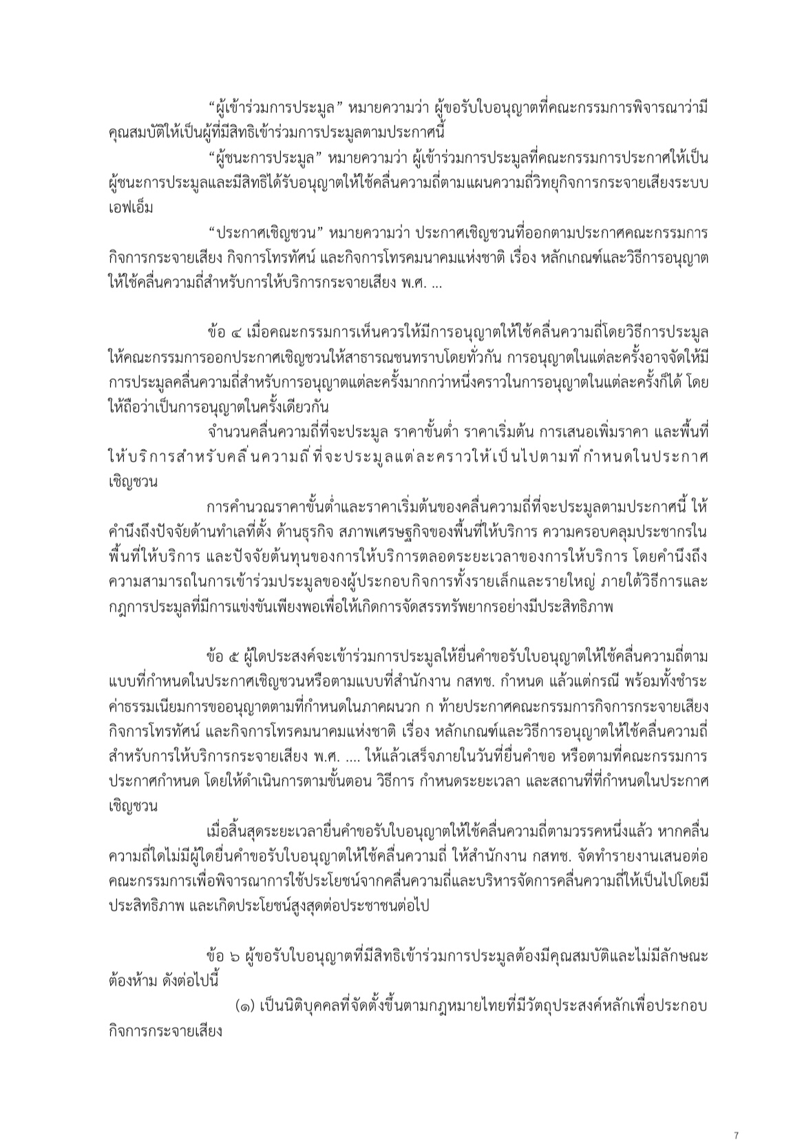 ผู้ขอรับใบอนุญาตจะต้องผ่านการตรวจสอบคุณสมบัติ ลักษณะต้องห้าม และเงื่อนไขการเป็น ผู้ที่มีผลประโยชน์ร่วมกันตามร่างประกาศฉบับนี้ และวางหลักประกันการประมูลให้แล้วเสร็จภายในระยะเวลา ที่กำหนด จึงจะสามารถเข้าร่วมการประมูลได้ โดยจะมีการประกาศรายชื่อผู้เข้าร่วมประมูลคลื่นความถี่ ในแต่ละคราวให้ทราบเป็นการทั่วไป หากปรากฏข้อเท็จจริงก่อนหรือหลังการรับใบอนุญาตให้ใช้คลื่นความถี่ว่า ผู้ขอรับใบอนุญาตที่เป็นผู้เข้าร่วมการประมูลหรือผู้ชนะการประมูลไม่มีคุณสมบัติและ/หรือมีลักษณะต้องห้าม หรือมีผลประโยชน์ร่วมกัน หรือมีการกระทำอันเป็นการขัดขวางการแข่งขันราคาอย่างเป็นธรรม กสทช. จะตัด รายชื่อผู้ขอรับใบอนุญาตดังกล่าวออกจากการเป็นผู้เข้าร่วมการประมูลหรือผู้ชนะการประมูล แล้วแต่กรณี และจะถูกริบหลักประกันการประมูล และถูกตัดสิทธิเข้าร่วมการประมูลเป็นระยะเวลาสองปีนับแต่วันที่ คณะกรรมการตัดรายชื่อบุคคลดังกล่าวออกจากการเป็นผู้เข้าร่วมการประมูลหรือผู้ชนะการประมูล และต้อง ชดใช้ค่าเสียหายในกรณีที่ต้องยกเลิกการประมูลนั้นในระหว่างเวลาการประมูล ผู้เข้าร่วมการประมูลมีสิทธิเสนอราคากี่ครั้งก็ได้ โดยเพิ่มขึ้นเป็น ลำดับตามที่กำหนดในประกาศเชิญชวน และจะต้องปฏิบัติตามวิธีการและเงื่อนไขการประมูล ให้เป็นไปตาม หลักเกณฑ์ที่กำหนดไว้ในร่างประกาศนี้