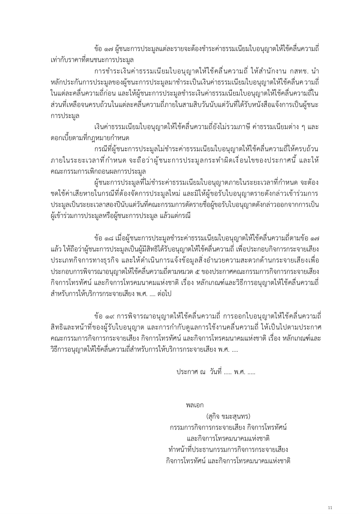 ผู้ชนะการประมูลแต่ละรายจะต้องชำระค่าธรรมเนียมใบอนุญาตให้ใช้คลื่นความถี่เท่ากับราคา ที่ตนชนะการประมูล ภายในระยะเวลาที่กำหนด และดำเนินการแจ้งข้อมูลสิ่งอำนวยความสะดวกด้านกระจาย เสียงเพื่อประกอบการพิจารณาอนุญาตให้ใช้คลื่นความถี่ตามหมวด ๕ ของประกาศ กสทช. เรื่อง หลักเกณฑ์ และวิธีการอนุญาตให้ใช้คลื่นความถี่สำหรับการให้บริการกระจายเสียง ต่อไป โดยการพิจารณาอนุญาตให้ใช้ คลื่นความถี่ การออกใบอนุญาตให้ใช้คลื่นความถี่ สิทธิและหน้าที่ของผู้รับใบอนุญาต และการกำกับดูแลการใช้ งานคลื่นความถี่ ให้เป็นไปตามประกาศ กสทช. เรื่อง หลักเกณฑ์และวิธีการอนุญาตให้ใช้คลื่นความถี่สำหรับ การให้บริการกระจายเสียง