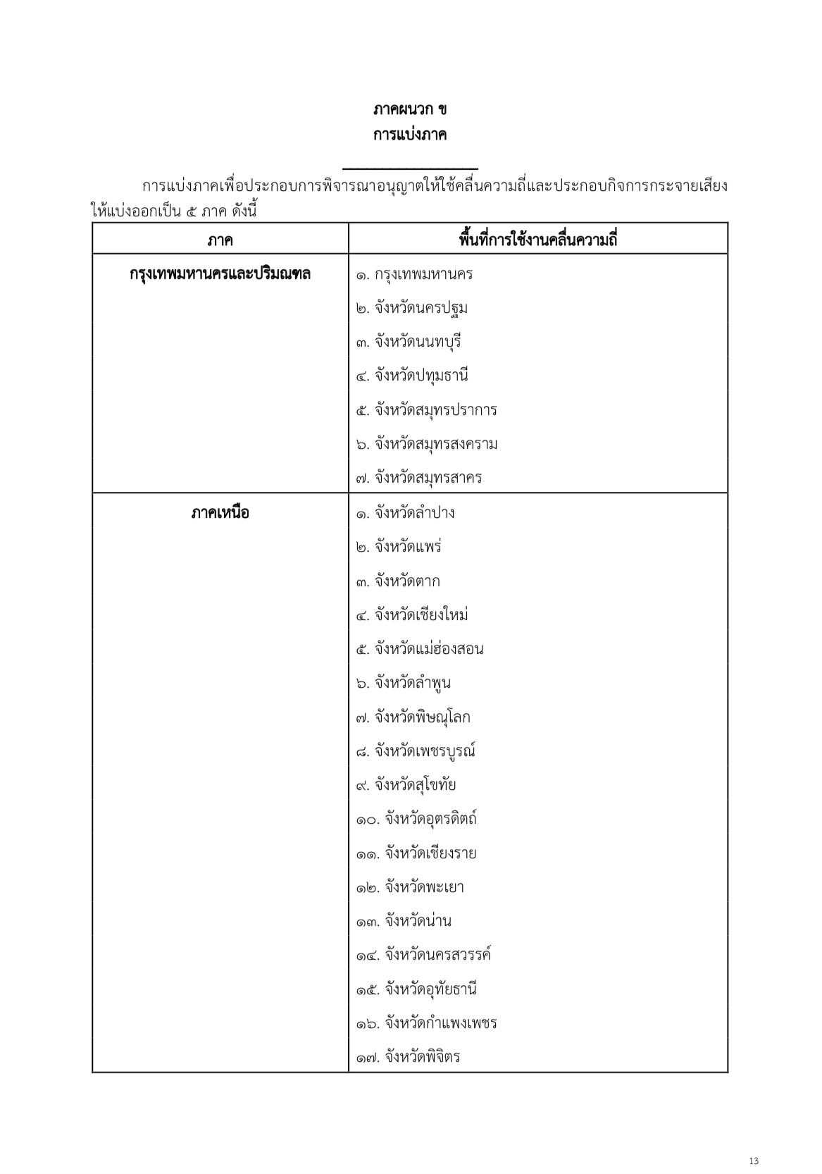 (๓) ผู้จำนวนรวมของคลื่นความถี่ที่ชนะการประมูล ซึ่งมีขอบเขตพื้นที่การใช้งานคลื่น ความถี่ ในทุกภาคของประเทศ ให้พิจารณาอนุญาตการใช้งานคลื่นความถี่ ระดับชาติ และให้ยื่นคำขออนุญาต ประกอบกิจการกระจายเสียง ประเภทกิจการทางธุรกิจ ระดับชาติ ทั้งนี้ การแบ่งภาค จะมีการแบ่งออกเป็น ๕ ภาค ตามภาคผนวก ข ของร่างประกาศฉบับนี้