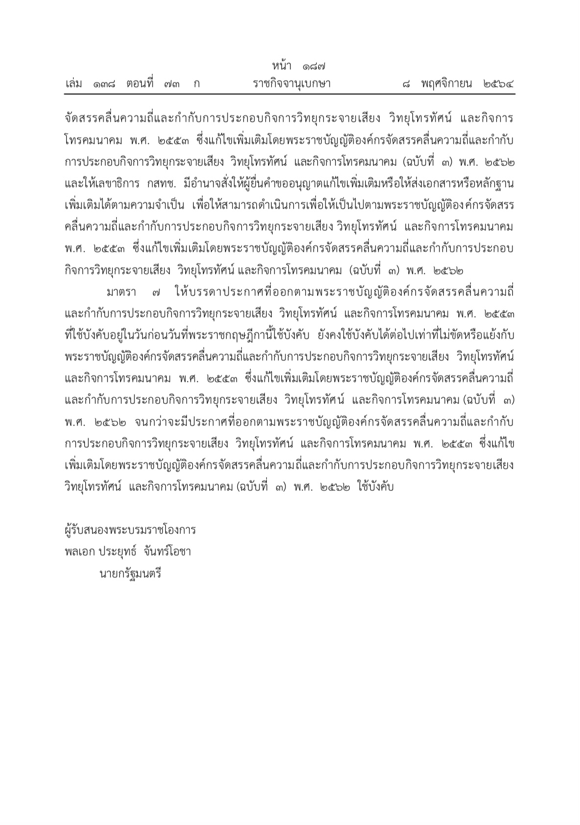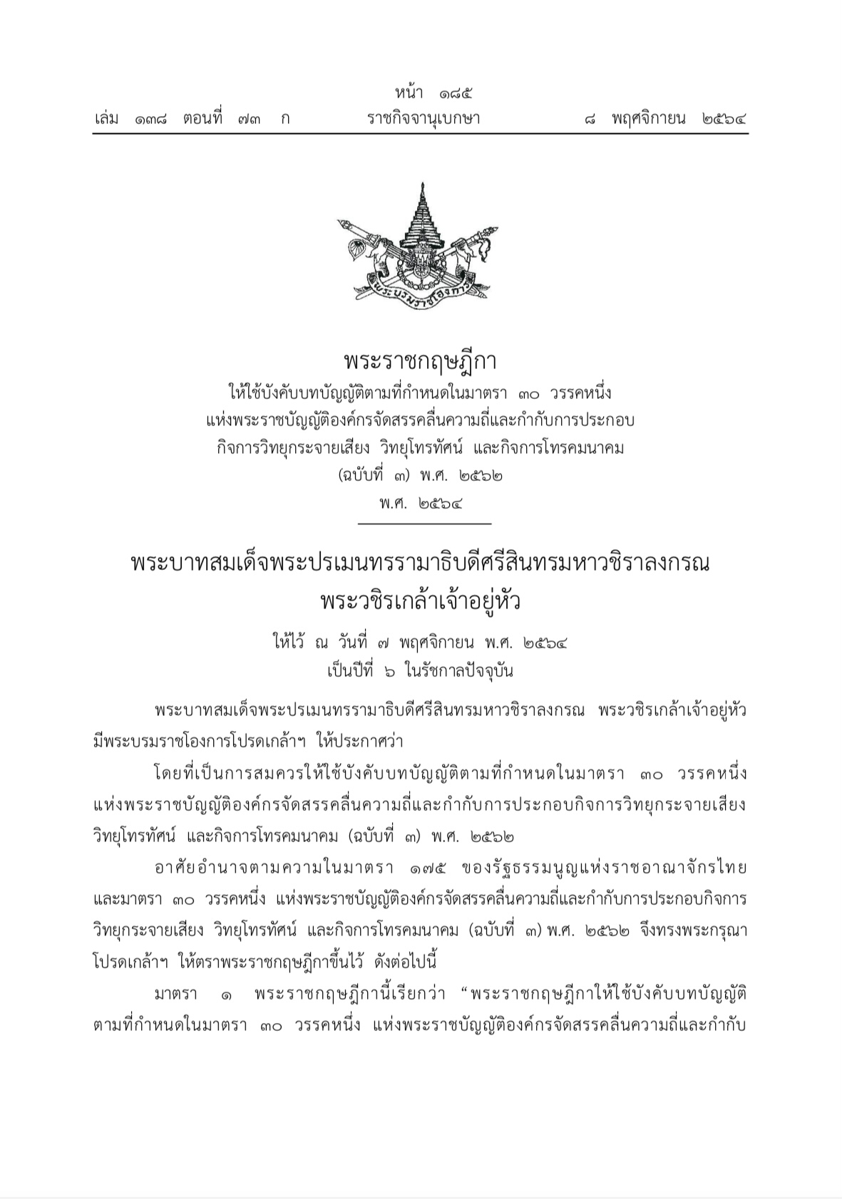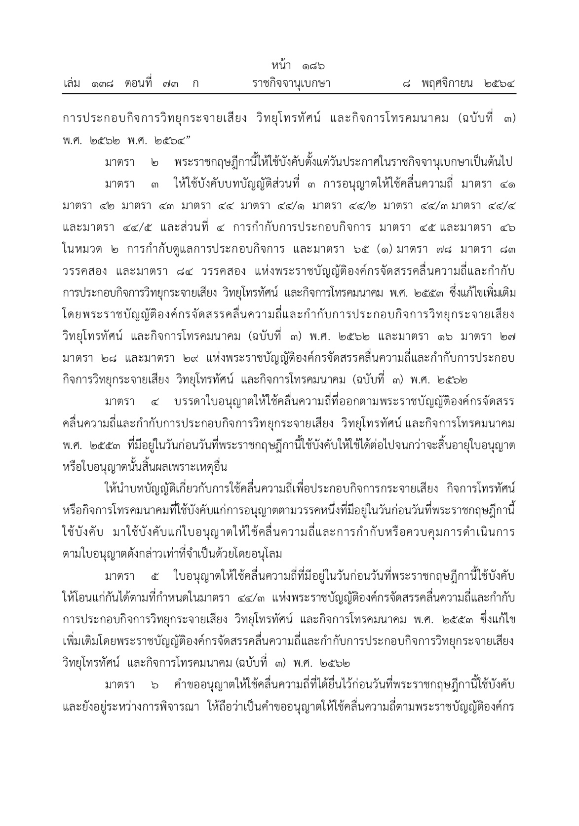 พระราชกฤษฎีกาให้ใช้บังคับบทบัญญัติตามที่กำหนดในมาตรา 30 วรรคหนึ่ง แห่งพระราชบัญญัติองค์กรจัดสรรคลื่นความถี่และกำกับการประกอบกิจการวิทยุกระจายเสียง วิทยุโทรทัศน์ และกิจการโทรคมนาคม (ฉบับที่ 3) พ.ศ. 2562 พ.ศ. 2564