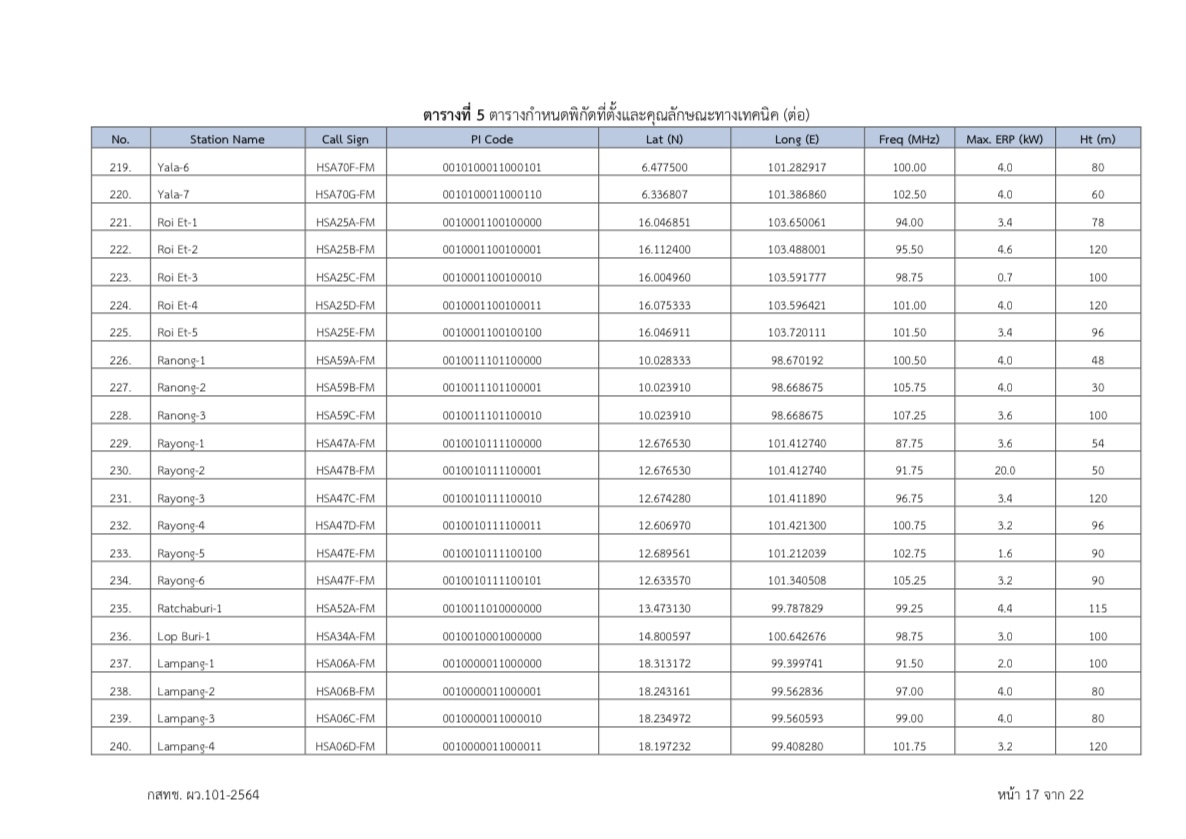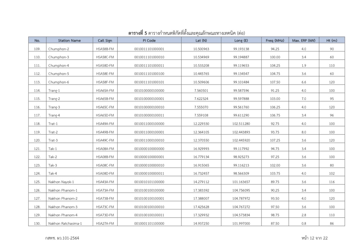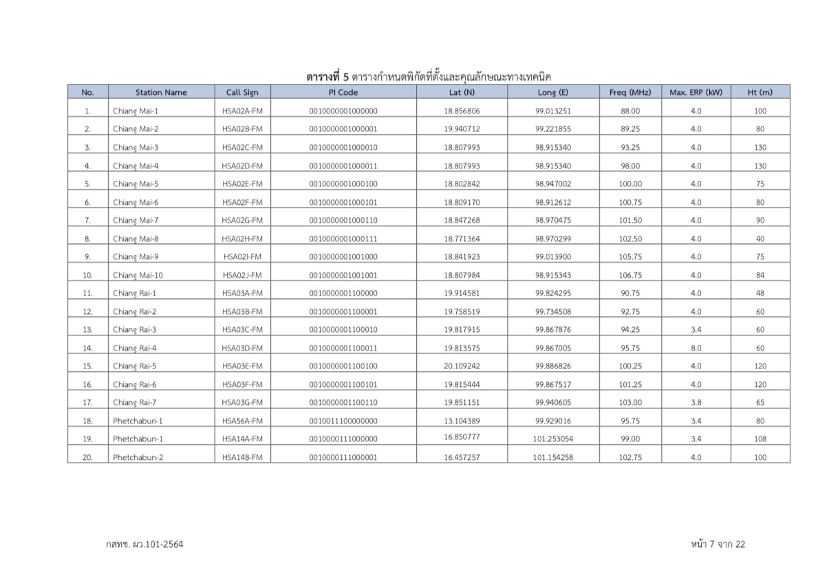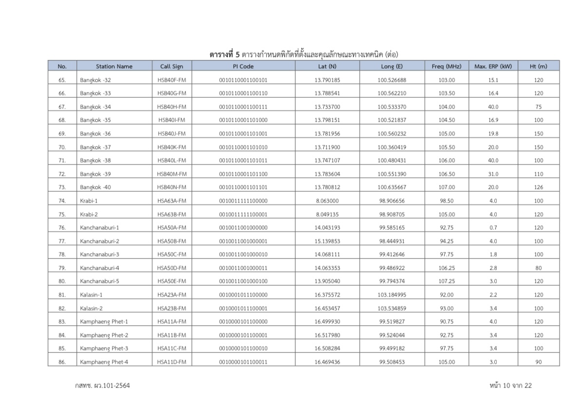 ข้อ ๕ ให้ส่วนราชการ รัฐวิสาหกิจ หรือหน่วยงานอื่นของรัฐ หรือผู้ได้รับอนุญาต สัมปทาน หรือสัญญาจากหน่วยงานดังกล่าวที่ประกอบกิจการวิทยุกระจายเสียง อยู่ในวันที่พระราชบัญญัติการประกอบกิจการกระจายเสียงและกิจการโทรทัศน์ พ.ศ. ๒๕๕๑ ใช้บังคับ และได้รับความเห็นชอบให้ถือครองคลื่นความถี่เพื่อประกอบกิจการวิทยุกระจายเสียง ตามพระราชบัญญัติองค์กรจัดสรรคลื่นความถี่และกำกับการประกอบกิจการวิทยุกระจายเสียง วิทยุโทรทัศน์ และกิจการโทรคมนาคม พ.ศ. ๒๕๕๓ ซึ่งมีสถานที่ตั้งสถานีวิทยุกระจายเสียงตามประกาศนี้ ให้สิทธิการใช้งานคลื่นความถี่ดังกล่าวสิ้นสุดในวันที่ ๔ เมษายน ๒๕๖๕