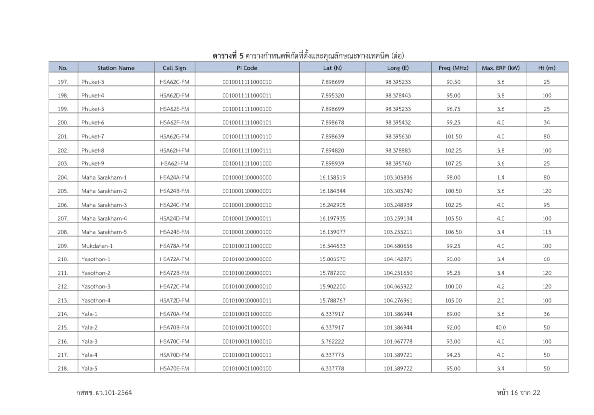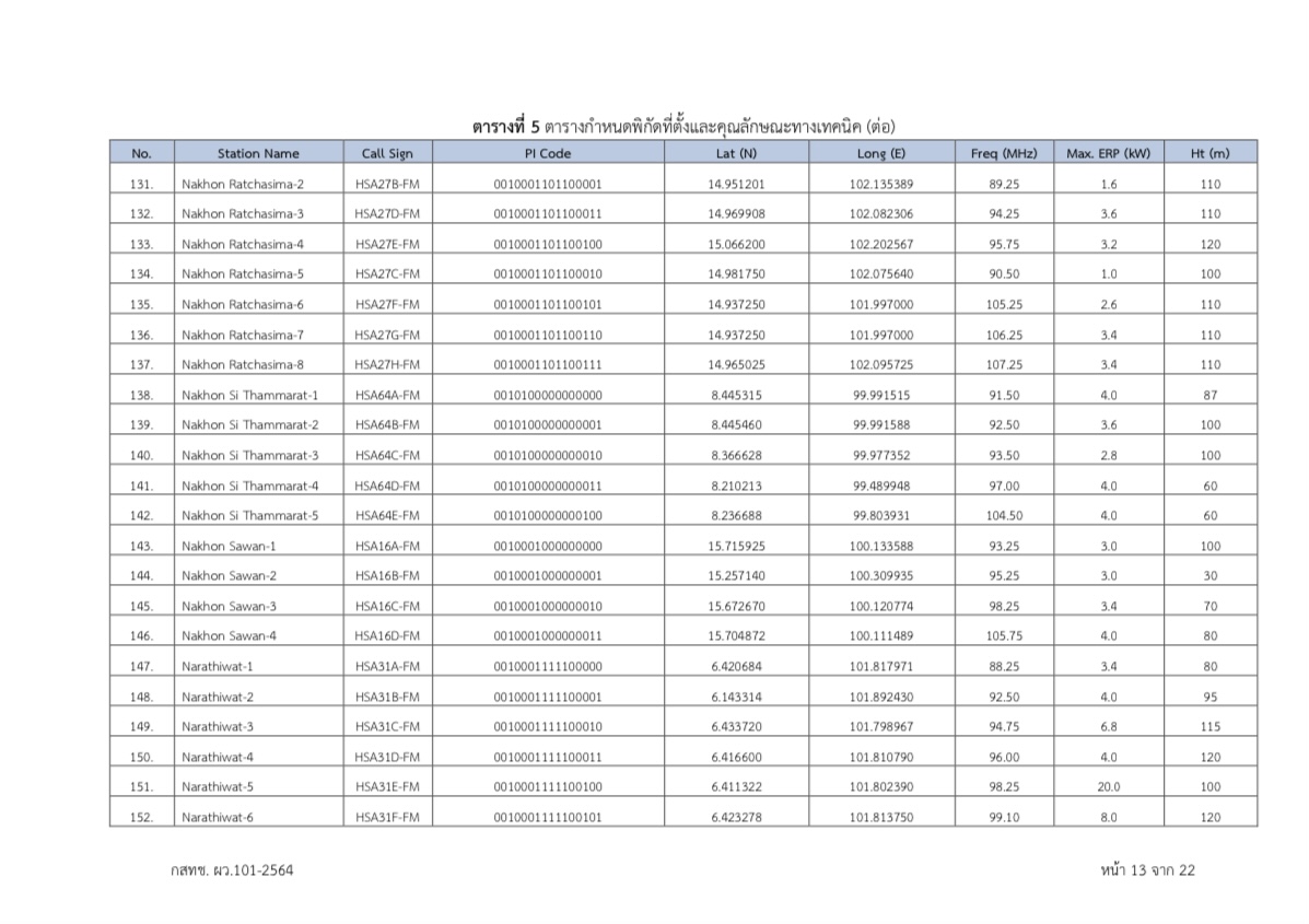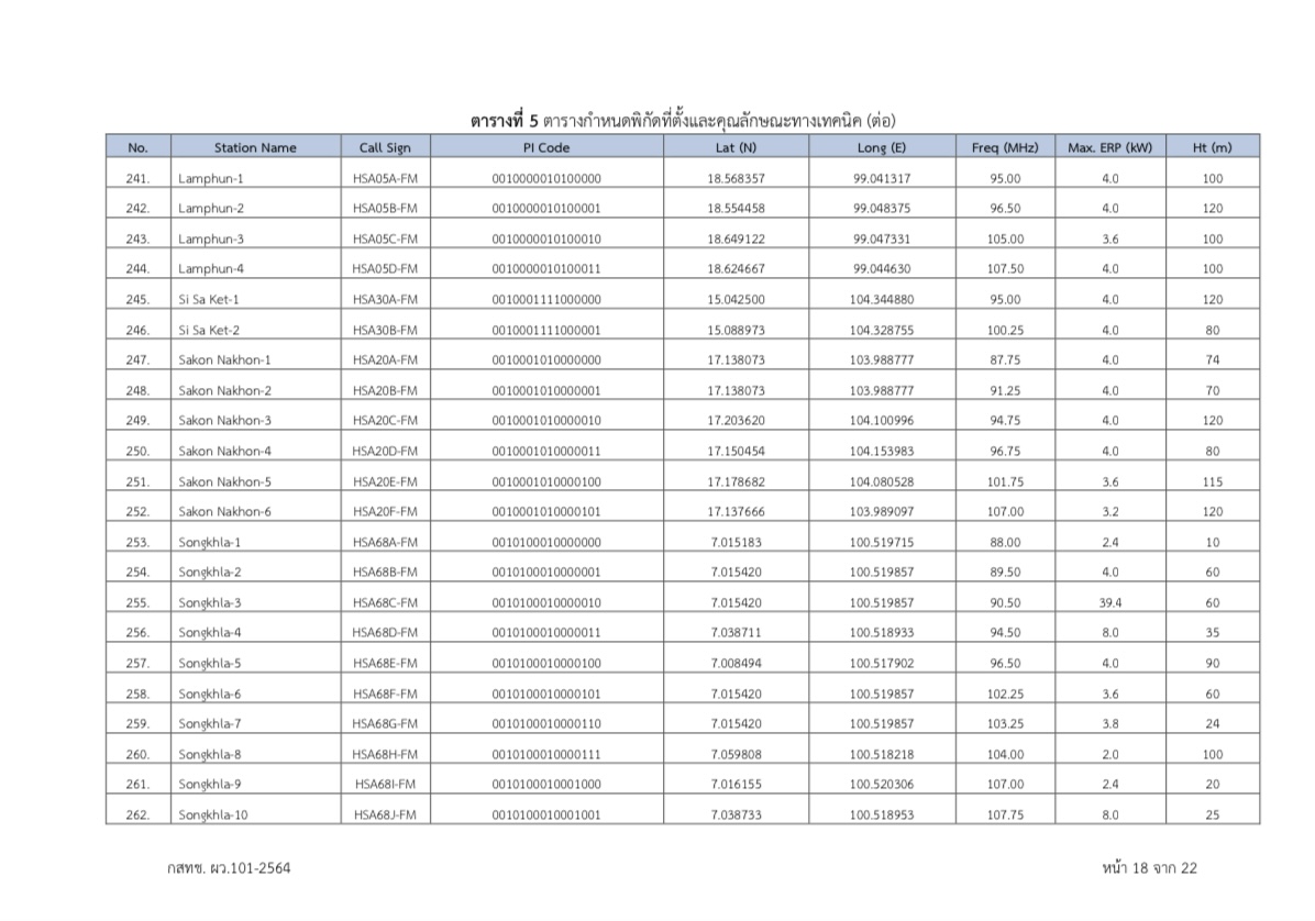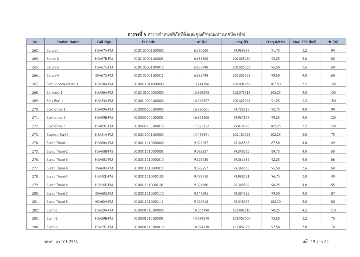 ข้อ ๕ ให้ส่วนราชการ รัฐวิสาหกิจ หรือหน่วยงานอื่นของรัฐ หรือผู้ได้รับอนุญาต สัมปทาน หรือสัญญาจากหน่วยงานดังกล่าวที่ประกอบกิจการวิทยุกระจายเสียง อยู่ในวันที่พระราชบัญญัติการประกอบกิจการกระจายเสียงและกิจการโทรทัศน์ พ.ศ. ๒๕๕๑ ใช้บังคับ และได้รับความเห็นชอบให้ถือครองคลื่นความถี่เพื่อประกอบกิจการวิทยุกระจายเสียง ตามพระราชบัญญัติองค์กรจัดสรรคลื่นความถี่และกำกับการประกอบกิจการวิทยุกระจายเสียง วิทยุโทรทัศน์ และกิจการโทรคมนาคม พ.ศ. ๒๕๕๓ ซึ่งมีสถานที่ตั้งสถานีวิทยุกระจายเสียงตามประกาศนี้ ให้สิทธิการใช้งานคลื่นความถี่ดังกล่าวสิ้นสุดในวันที่ ๔ เมษายน ๒๕๖๕