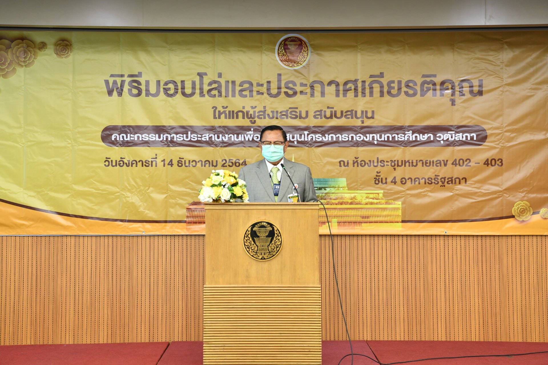 วันที่ 14 ธันวาคม 2564 เวลา 10.00 นาฬิกา ณ ห้องประชุมหมายเลข 402 – 403 ชั้น 4 อาคารรัฐสภา (ฝั่งวุฒิสภา) คณะกรรมการประสานงานเพื่อสนับสนุนโครงการกองทุนการศึกษา วุฒิสภา จัดพิธีมอบโล่และประกาศเกียรติคุณให้แก่ผู้ส่งเสริมสนับสนุนคณะกรรมการฯ โดยมีนายศุภชัย สมเจริญ รองประธานวุฒิสภา คนที่สอง ในฐานะประธานคณะกรรมการ เป็นประธานในพิธี นางปัณณิตา สท้านไตรภพ รองเลขาธิการวุฒิสภา กล่าวรายงาน และมีสมาชิกวุฒิสภา ผู้บริหารสำนักงานเลขาธิการวุฒิสภา และผู้รับมอบโล่และประกาศเกียรติคุณจากหน่วยงานภาครัฐและภาคเอกชน เข้าร่วมพิธี