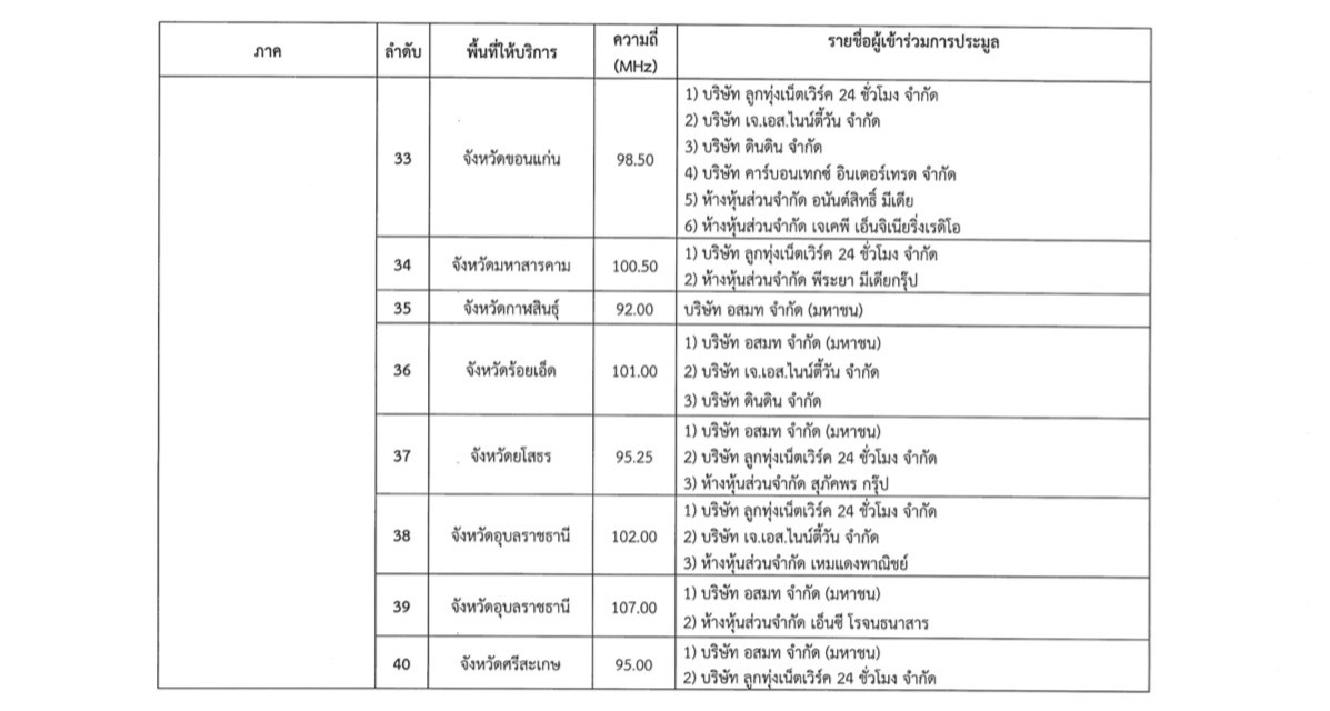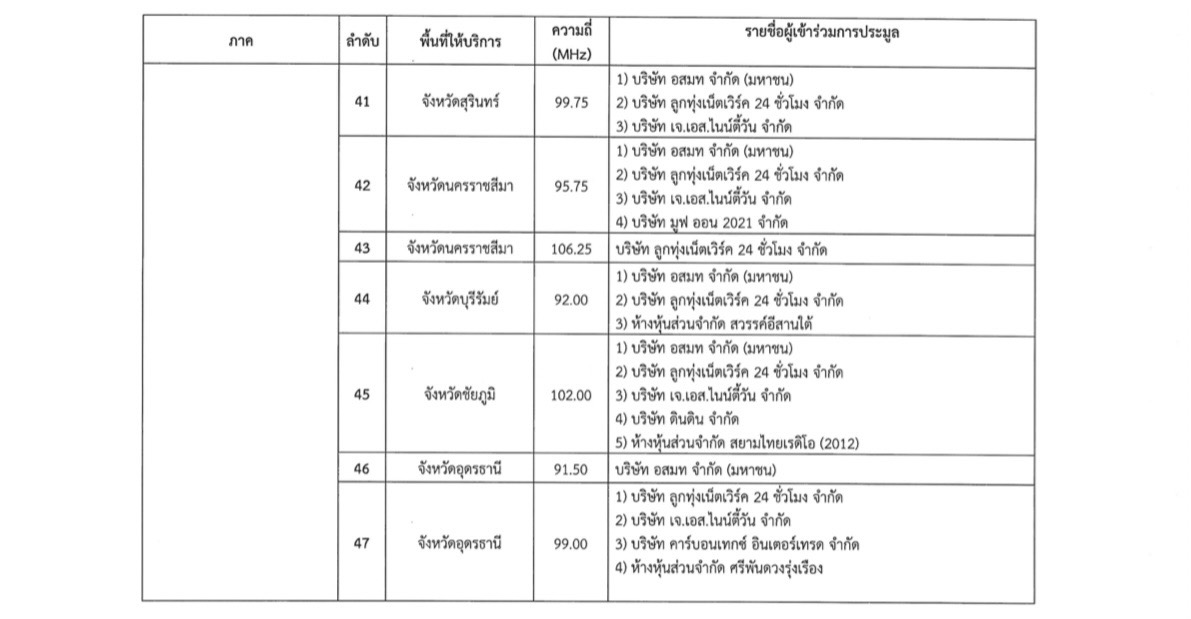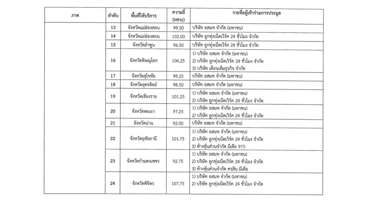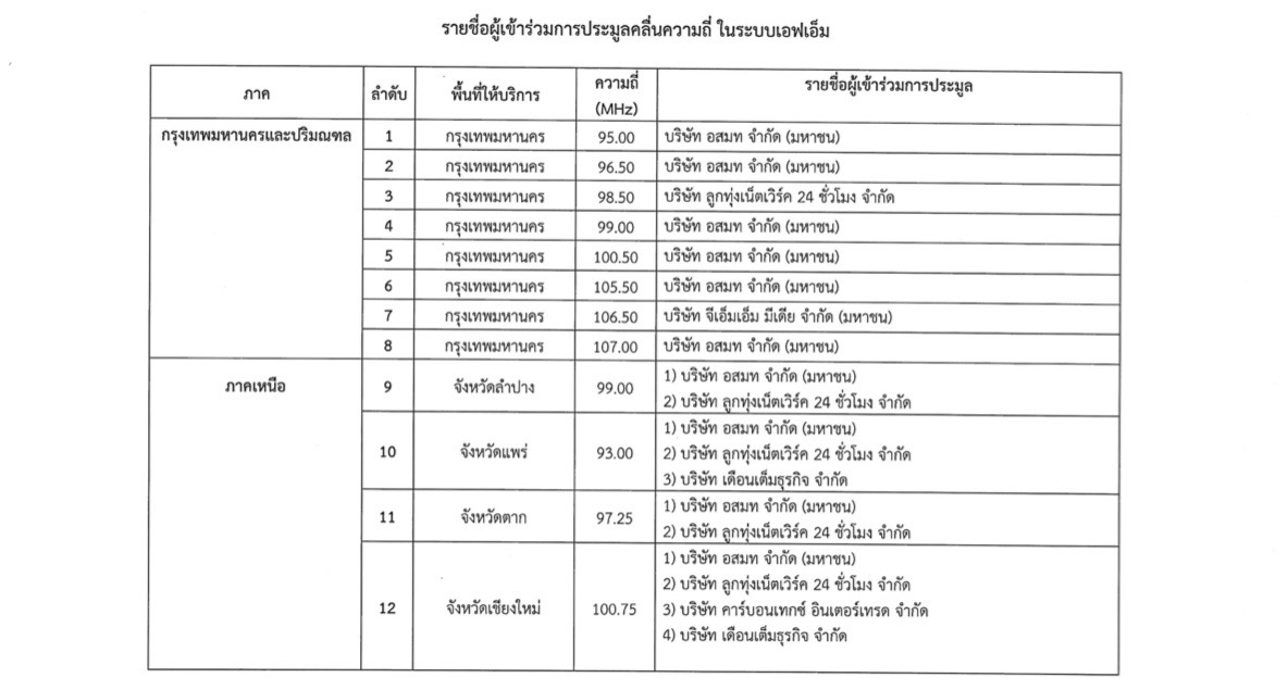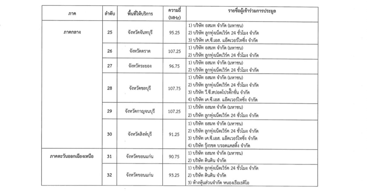 รายชื่อผู้เข้าร่วมการประมูลคลื่นความถี่ ในระบบเอฟเอ็ม