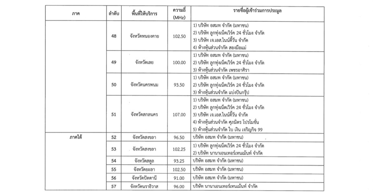 ประกาศสำนักงาน กสทช. เรื่อง รายชื่อผู้เข้าร่วมการประมูลคลื่นความถี่ ระบบเอฟเอ็ม ประเภทบริการทางธุรกิจ