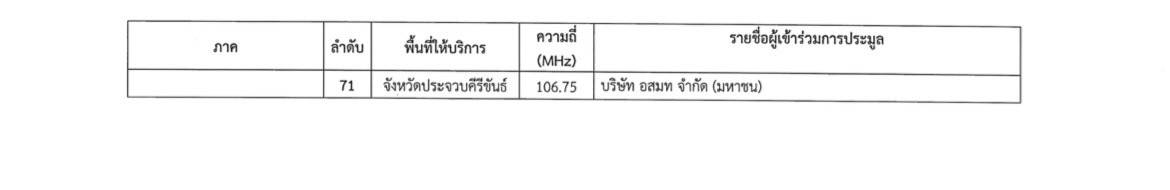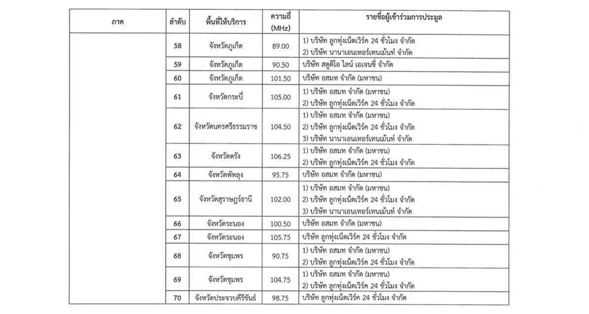 บัดนี้ ครบกําหนดระยะเวลาการวางหลักประกันการประมูลแล้ว สํานักงาน กสทช. จึงขอประกาศ รายชื่อผู้เข้าร่วมการประมูลคลื่นความถี่ ในระบบเอฟเอ็ม จํานวน 71 คลื่นความถี่ ให้ทราบเป็นการทั่วไป รายละเอียดตามเอกสารแนบท้ายนี้