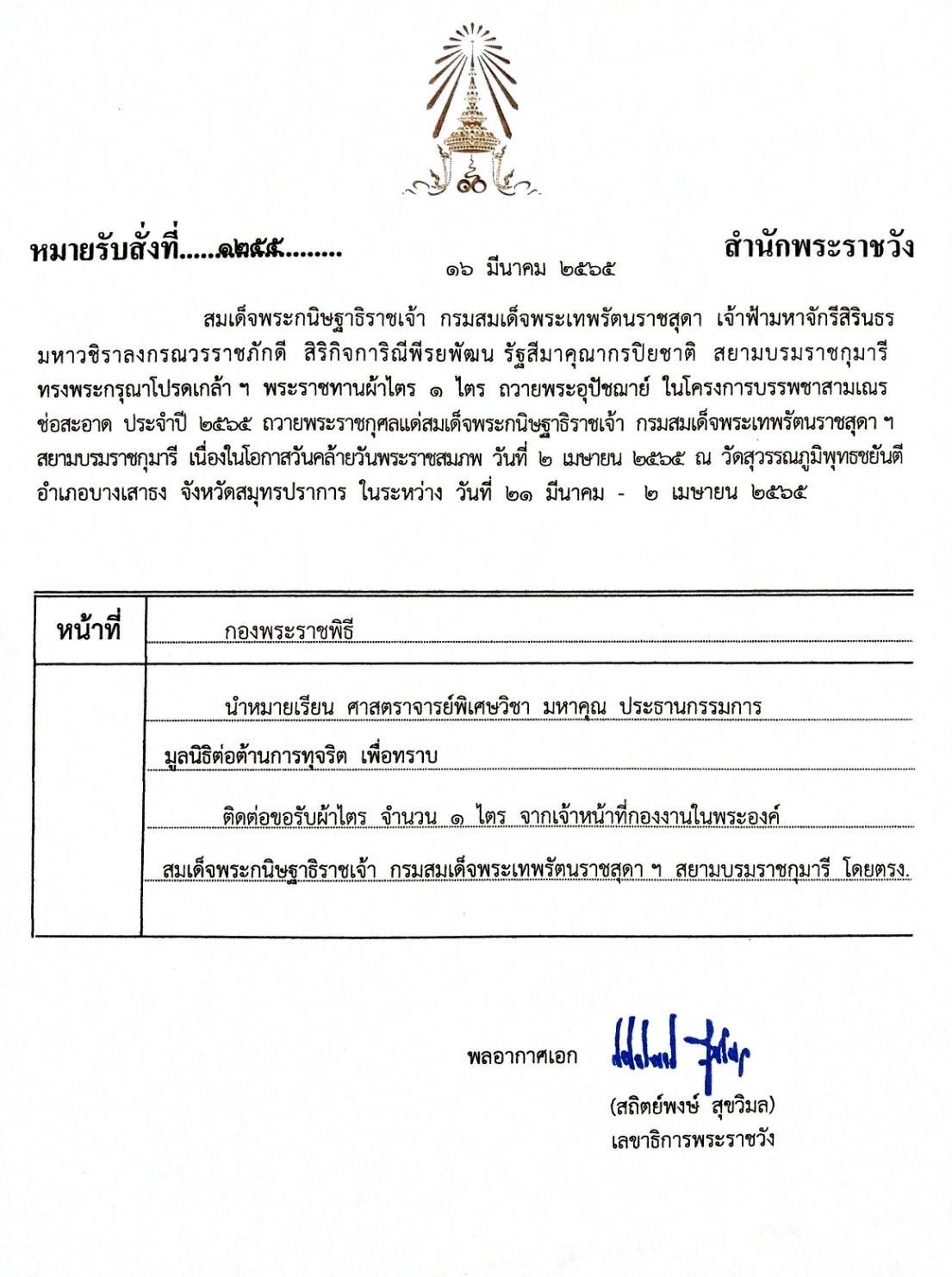 “...สมเด็จพระกนิษฐาธิราชเจ้า กรมสมเด็จพระเทพรัตนราชสุดา เจ้าฟ้ามหาจักรีสิรินธร มหาวชิราลงกรณ วรราชภักดี สิริกิจการิณีพีรยพัฒน รัฐสีมาคุณากรปิยชาติ สยามบรมราชกุมารี ทรงพระกรุณาโปรดเกล้าฯ พระราชทาน ผ้าไตร 1 ไตร ถวายพระอุปัชฌาย์ ในโครงการบรรพชาสามเณรช่อสะอาด ถวายเป็นพระราชกุศลแด่สมเด็จพระกนิษฐาธิราชเจ้า กรมสมเด็จพระเทพรัตนราชสุดาฯ สยามบรมราชกุมารี ทรงเจริญพระชนมพรรษา 67 พรรษา ในวันที่ 2 เมษายน 2565..."
