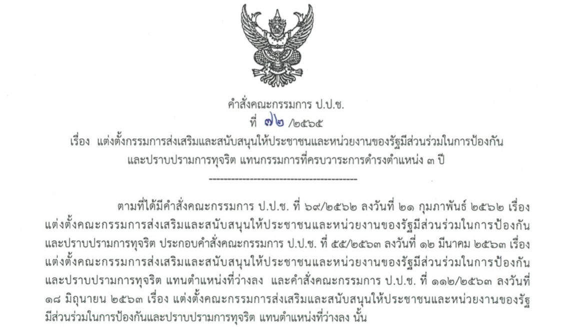 คำสั่งคณะกรรมการ ป.ป.ช. ที่ 72/2565 เรื่อง แต่งตั้งกรรมการส่งเสริมและสนับสนุนให้ประชาชนและหน่วยงานของรัฐมีส่วนร่วมในการป้องกันและปราบปรามการทุจริต แทนกรรมการที่ครบวาระการดำรงตำแหน่ง 3 ปี