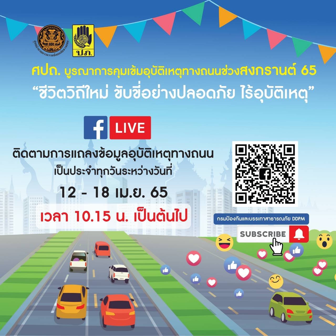 ศูนย์อำนวยการความปลอดภัยทางถนน (ศปถ.) โดยความร่วมมือของกรมป้องกันและบรรเทาสาธารณภัย กระทรวงมหาดไทย สำนักงานตำรวจแห่งชาติ กระทรวงสาธารณสุข กระทรวงคมนาคม กระทรวงยุติธรรม และหน่วยงานที่เกี่ยวข้อง จึงได้บูรณาการขับเคลื่อนมาตรการป้องกันและลดอุบัติเหตุทางถนน ภายใต้แนวคิด “ชีวิตวิถีใหม่ ขับขี่อย่างปลอดภัย ไร้อุบัติเหตุ” โดยจัดตั้งศูนย์อำนวยการป้องกันและลดอุบัติเหตุทางถนนช่วงเทศกาลสงกรานต์2565 ภายใต้การดำเนินการของศูนย์อำนวยการป้องกันและลดอุบัติเหตุทางถนนตลอดทั้งปี ดำเนินการเข้มข้นในช่วงวันที่ 11 – 17 เมษายน 2565 ที่ห้องประชุม 1 ปภ. อาคาร 3 ชั้น 5 เพื่อเป็นศูนย์กลางในการรวบรวมข้อมูลสถิติอุบัติเหตุทางถนนช่วงเทศกาลสงกรานต์ 2565 พร้อมประสานสั่งการแก้ไขปัญหาอุบัติเหตุทางถนนให้สอดคล้องกับสภาพปัญหา