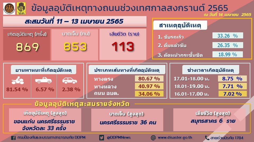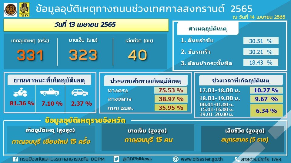 วันที่ 14 เมษายน 2565 เวลา 10.30 น. ที่กรมป้องกันและบรรเทาสาธารณภัย ศูนย์อำนวยการป้องกันและลดอุบัติเหตุทางถนนช่วงเทศกาลสงกรานต์ พ.ศ.2565 สรุปสถิติอุบัติเหตุทางถนนประจำวันที่ 13 เมษายน 2565 เกิดอุบัติเหตุ 331 ครั้ง ผู้เสียชีวิต 40 ราย ผู้บาดเจ็บ 323 คน สถิติอุบัติเหตุสะสม 3 วัน (11-13 เมษายน 2565) เกิดอุบัติเหตุรวม 869 ครั้ง ผู้เสียชีวิต 113 ราย ผู้บาดเจ็บ 853 คน กำชับจังหวัดเพิ่มความเข้มข้นในการปฏิบัติงานของจุดตรวจและด่านชุมชน เน้นกวดขันพฤติกรรมเสี่ยงอุบัติเหตุ โดยเฉพาะกลุ่มผู้ขับขี่รถจักรยานยนต์ไม่สวมหมวกนิรภัย เพื่อป้องปรามผู้ขับขี่ที่มีพฤติกรรมเสี่ยงอุบัติเหตุ