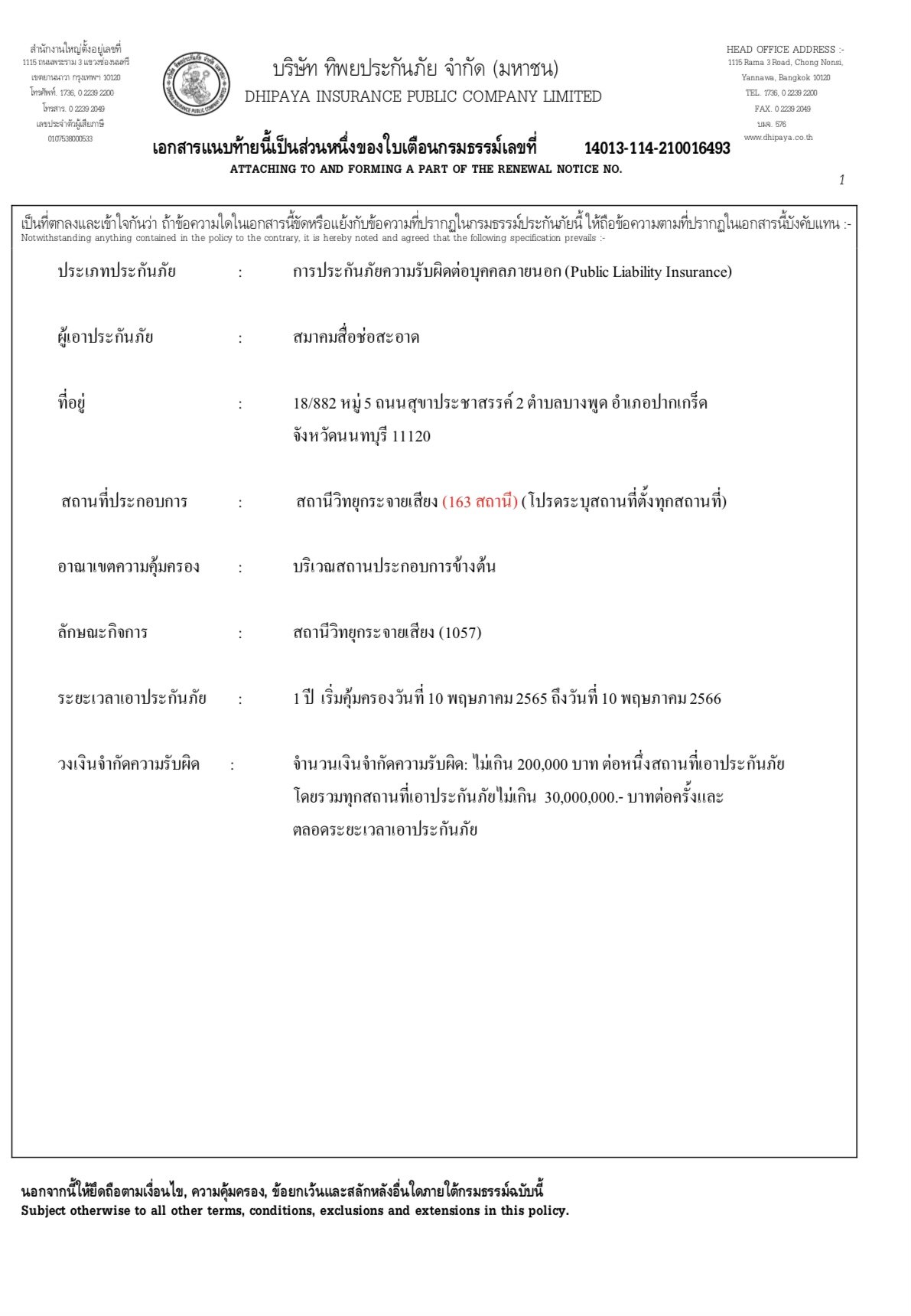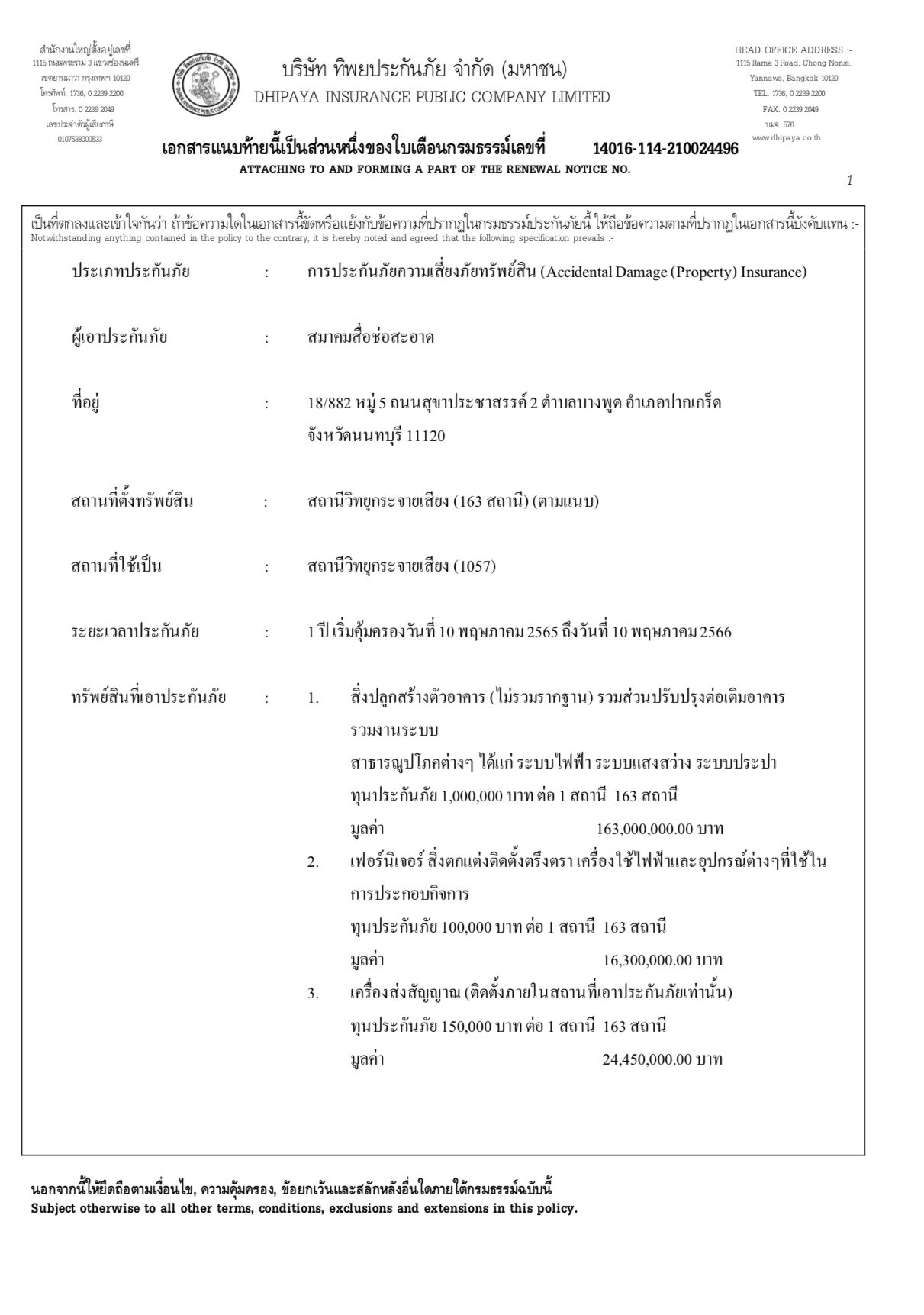 โครงการประกันภัยความเสี่ยงภัยทรัพย์สิน "สถานีวิทยุกระจายเสียงสังกัดสมาคมสื่อช่อสะอาด" ประจำปี 2565 - 2566