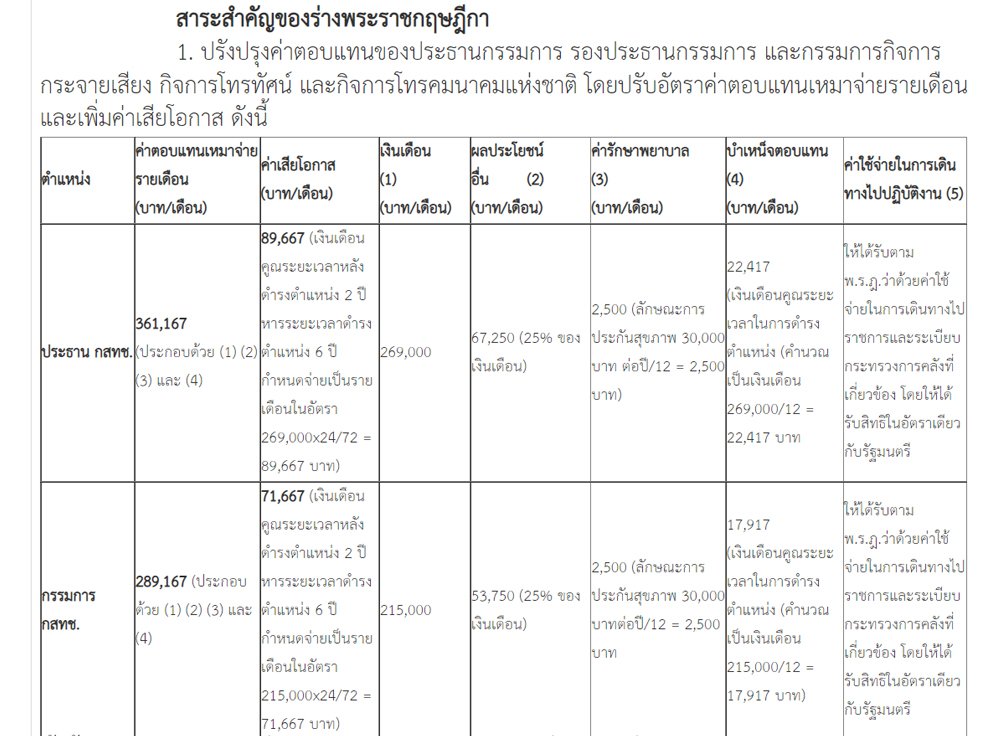 ทั้งนี้ ร่าง พ.ร.ฎ.ฉบับดังกล่าว เป็นการปรับปรุง พ.ร.ฎ.ค่าตอบแทนและค่าใช้จ่ายอันเกี่ยวกับการเดินทางไปปฏิบัติหน้าที่ต่างท้องที่ของประธานกรรมการ รองประธานกรรมการ และกรรมการกิจการกระจายเสียงกิจการโทรทัศน์ และกิจการโทรคมนาคมแห่งชาติ พ.ศ.2556 โดยปรับอัตราค่าตอบแทนเหมาจ่ายเป็นรายเดือน เพื่อให้สอดคล้องกับอำนาจหน้าที่และความรับผิดชอบที่เพิ่มขึ้นตามที่กฎหมายบัญญัติ