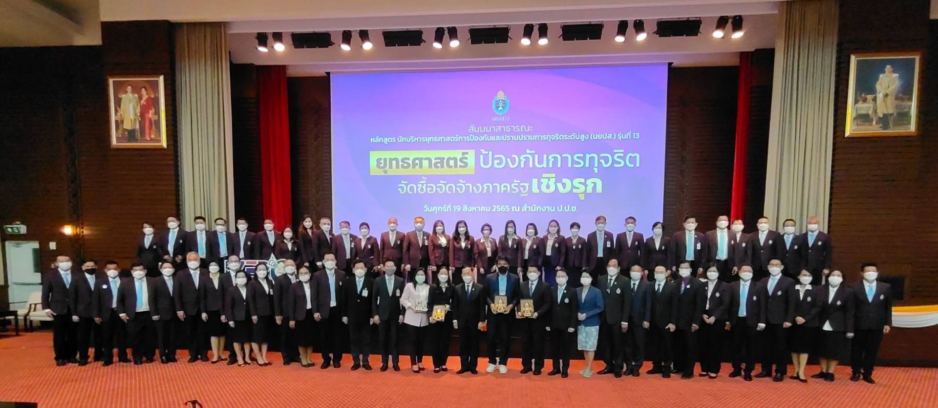 เมื่อวันที่ 19 สิงหาคม 2565 ที่ห้องประชุมนนทบุรี 1 ชั้น 3 อาคาร 4 สำนักงาน ป.ป.ช. ในการสัมมนาสาธารณะ หลักสูตรนักบริหารยุทธศาสตร์การป้องกันและปราบปรามการทุจริตระดับสูง (นยปส.) รุ่นที่ 13 เรื่อง “ยุทธศาสตร์ป้องกันการทุจริตจัดซื้อจัดจ้างภาครัฐเชิงรุก” โดยมี พล.ต.อ.วัชรพล ประสารราชกิจ ประธานคณะกรรมการป้องกันและปราบปรามการทุจริตแห่งชาติ (ป.ป.ช.) เป็นประธานเปิดการสัมมนาสาธารณะ
