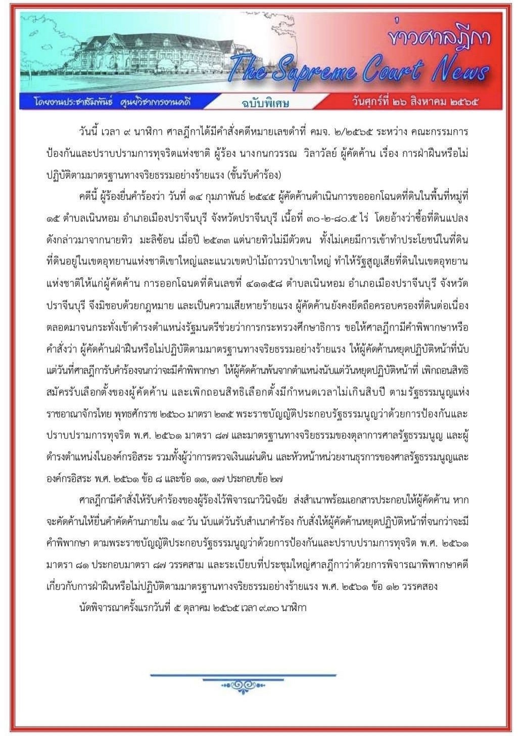ศาลฎีกาสั่ง ‘กนกวรรณ วิลาวัลย์’ รมช.ศึกษาธิการ หยุดปฏิบัติหน้าที่จนกว่าจะมีคำพิพากษา หลังรับคำร้อง ป.ป.ช. ยื่นฟ้อง ผิดจริยธรรมร้ายแรง คดีรุกป่าเขาใหญ่ นัดพิจารณาครั้งแรกวันที่ 5 ตุลาคม 2565