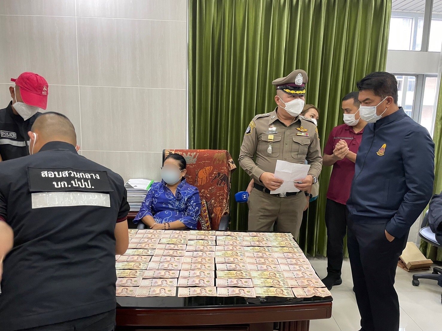จนกระทั้งวันที่ 7 กันยายน 2565 เวลาประมาณ 16.00 น. ซึ่งเป็นเวลานัดหมาย เจ้าหน้าที่ตำรวจ บก.ปปป. พร้อมเจ้าหน้าที่สำนักงาน ป.ป.ช. และสำนักงาน ป.ป.ท. ได้นำเงินสด จำนวน 79,188 บาท ที่ลงบันทึกประจำวันเป็นหลักฐานแล้ว ไปส่งมอบให้กับ นางจุรีพร ขันตี โดยมีเจ้าหน้าที่ของทั้งสามหน่วยงานได้วางกำลังซุ่มเฝ้าสังเกตการณ์อยู่บริเวณโดยรอบ และเมื่อได้ส่งมอบเงินเรียบร้อยแล้ว ทางเจ้าหน้าที่จึงได้เข้าไปยังห้องทำงานจุดส่งมอบเงินทันที พร้อมแสดงตัวเป็นเจ้าหน้าที่เพื่อเข้าทำการจับกุมผู้ต้องหา โดยได้ตรวจค้นพบว่ามีเงินสดจำนวน จำนวน 79,188 บาท วางอยู่บนโต๊ะ ทำงานของ นางจุรีพรฯ สอบถามแล้ว นางจุรีพรฯ อ้างว่าเป็นเงินที่รับไว้จริง แต่ปฏิเสธว่าไม่ได้กระทำความผิด เจ้าหน้าที่จึงได้ทำการตรวจสอบเงินสด 79,188 บาทบนโต๊ะดังกล่าวต่อหน้าผู้ต้องหา พบว่าหมายเลขบนธนบัตรตรงกับหมายเลขธนบัตรที่ ลงบันทึกประจำวันไว้ทุกฉบับ จึงได้แจ้งพฤติการณ์และข้อกล่าวหาให้ผู้ต้องหาทราบว่าเป็นความผิดฐาน