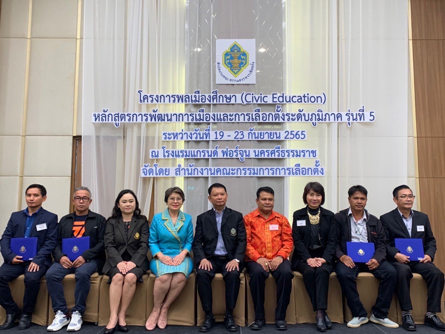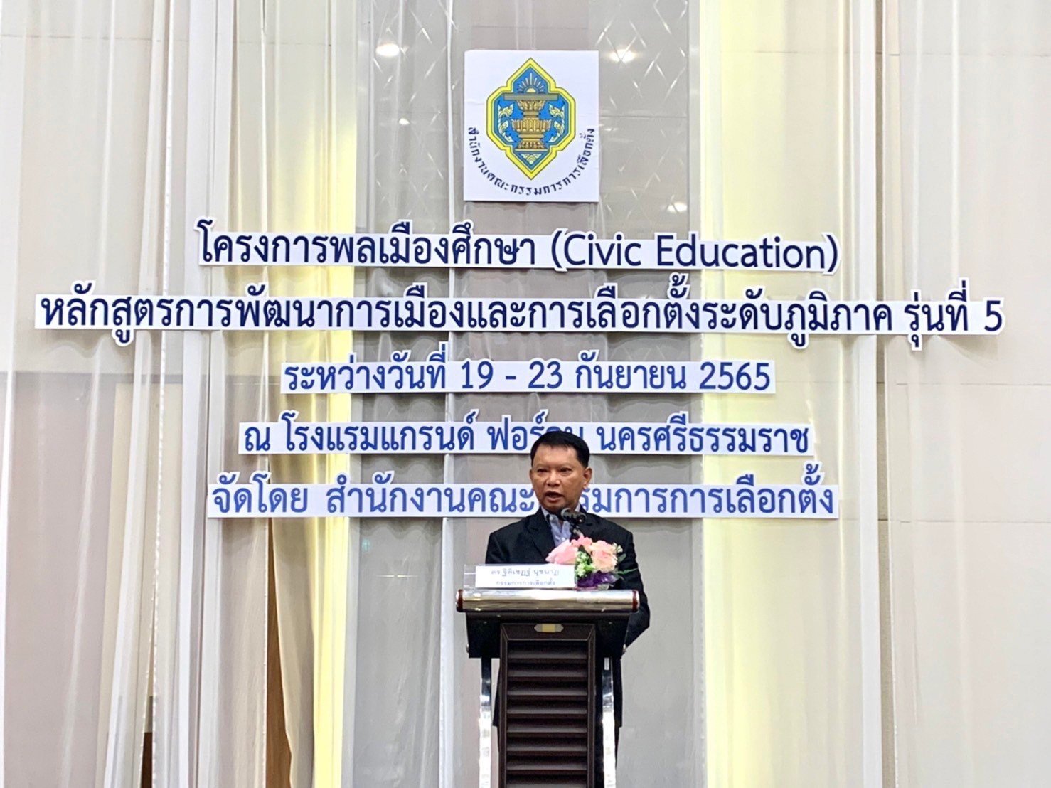 วันที่ 23 กันยายน 2565 ดร.ฐิติเชฏฐ์ นุชนาฏ กรรมการการเลือกตั้ง เป็นประธานพิธีปิดและมอบวุฒิบัตรผู้ผ่านการอบรมโครงการพลเมืองศึกษา (Civic Education) กิจกรรมเสริมสร้างความรู้ประชาธิปไตยแก่บุคลากรทางการเมือง บุคลากรภาครัฐ ภาคเอกชน และประชาชนทั่วไปในส่วนภูมิภาคและท้องถิ่น หลักสูตรการพัฒนาการเมืองและการเลือกตั้งระดับภูมิภาค รุ่นที่ 5 โดยสถาบันพัฒนาการเมืองและการเลือกตั้ง สำนักงานคณะกรรมการการเลือกตั้ง มีวัตถุประสงค์เพื่อสร้างความรู้ความเข้าใจที่ถูกต้องเกี่ยวกับการปกครองในระบอบประชาธิปไตยอันมีพระมหากษัตริย์ทรงเป็นประมุข โดยมีผู้เข้ารับการอบรม ประกอบด้วย ผู้บริหารท้องถิ่น สมาชิกสภาท้องถิ่น หัวหน้าหน่วยงานภาครัฐ ผู้บริหารสถาบันการศึกษา ผู้บริหารภาคเอกชน องค์กรเอกชน ตัวแทนพรรคการเมือง สมาชิกพรรคการเมือง นักวิชาการ สื่อมวลชน และประชาชนที่สนใจ ระหว่างวันที่ 19 - 23 กันยายน 2565 ณ โรงแรมแกรนด์ ฟอร์จูน โฮเต็ล จังหวัดนครศรีธรรมราช