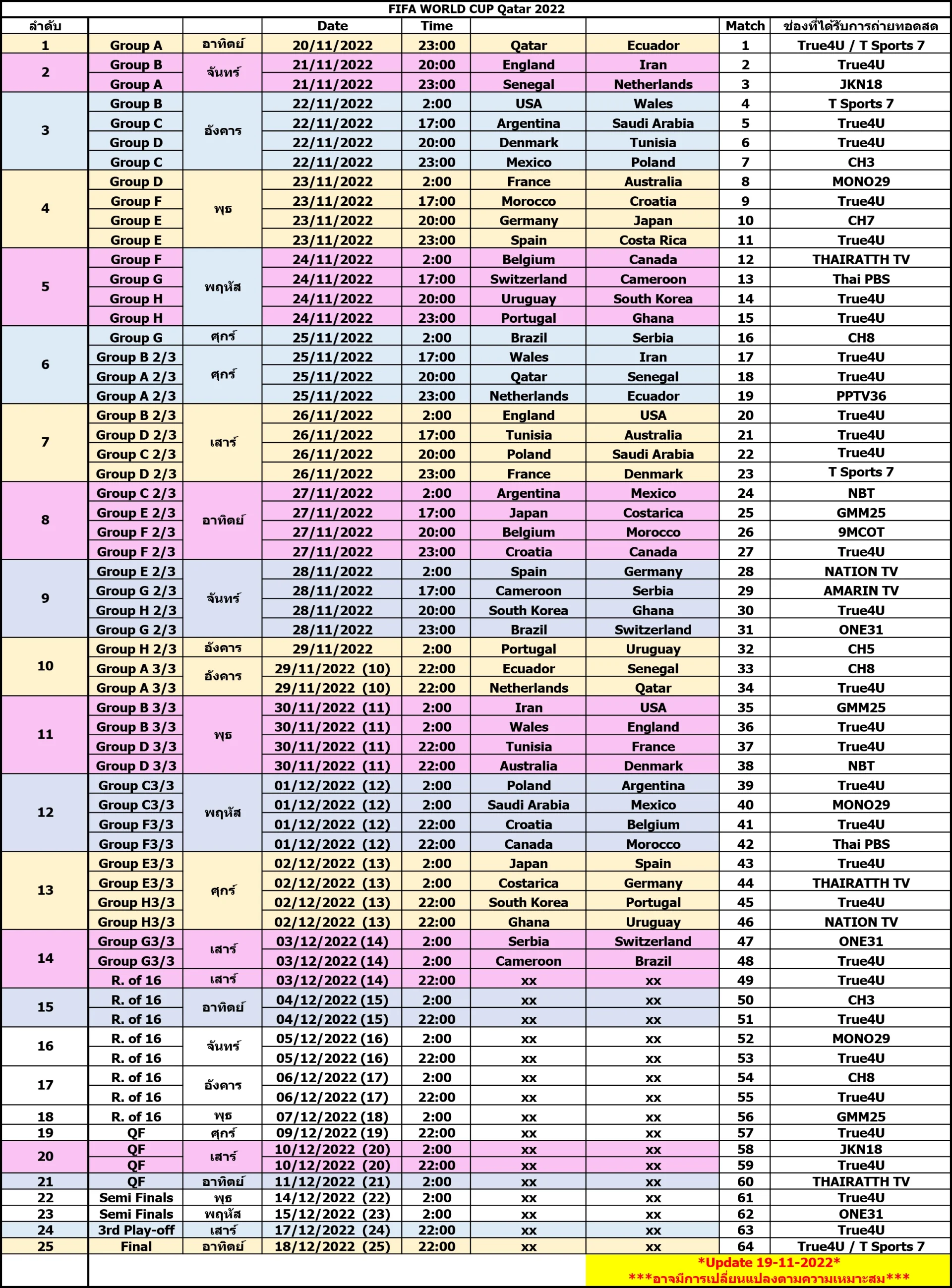 หลังประเทศไทยบรรลุผลเจรจาซื้อลิขสิทธิ์ถ่ายทอดสดฟุตบอลโลก 2022 รอบสุดท้าย ที่ประเทศกาตาร์ ระหว่างวันที่ 20 พฤศจิกายน - 18 ธันวาคม 2565 กับเอเยนต์ของสหพันธ์ฟุตบอลนานาชาติ วงเงิน 33 ล้านเหรียญสหรัฐ หรือประมาณ 1,200 ล้านบาท เมื่อวันที่ 17 พฤศจิกายน 2565 ซึ่งถ้ารวมค่าใช้จ่ายภาษี ยอดรวมจะอยู่ที่ประมาณ 1,400 ล้านบาท