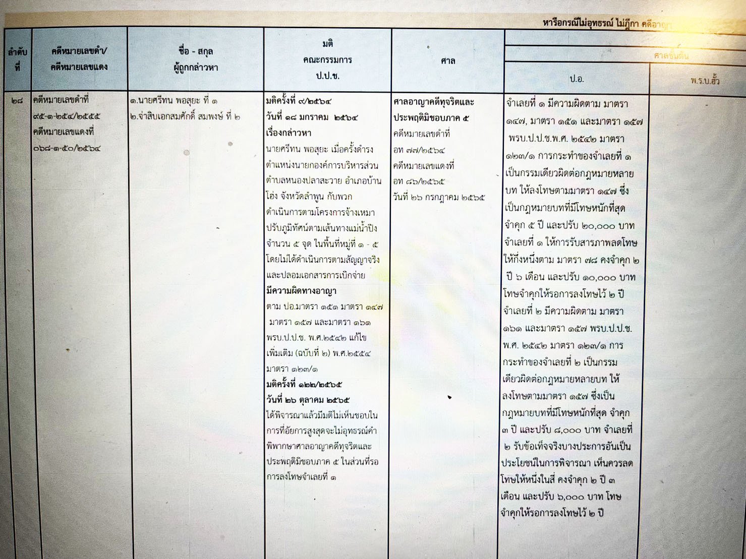 เผยแพร่ความคืบหน้าคดีกล่าวหา 'ศรีทน พอสุยะ' อดีตนายก อบต.หนองปลาสะวาย ลำพูน จ้างเหมาปรับภูมิทัศน์ตามเส้นทางแม่น้ำปิง 5 จุดเท็จ ปลอมเอกสารเบิกจ่าย ล่าสุด ศาลอาญาคดีทุจริตประพฤติมิชอบภาค 5 พิพากษาลงโทษจำคุก 2 ปี 6 เดือน แต่ได้รอลงอาญา - ป.ป.ช. ค้าน อสส.ไม่อุทธรณ์สู้ต่อ