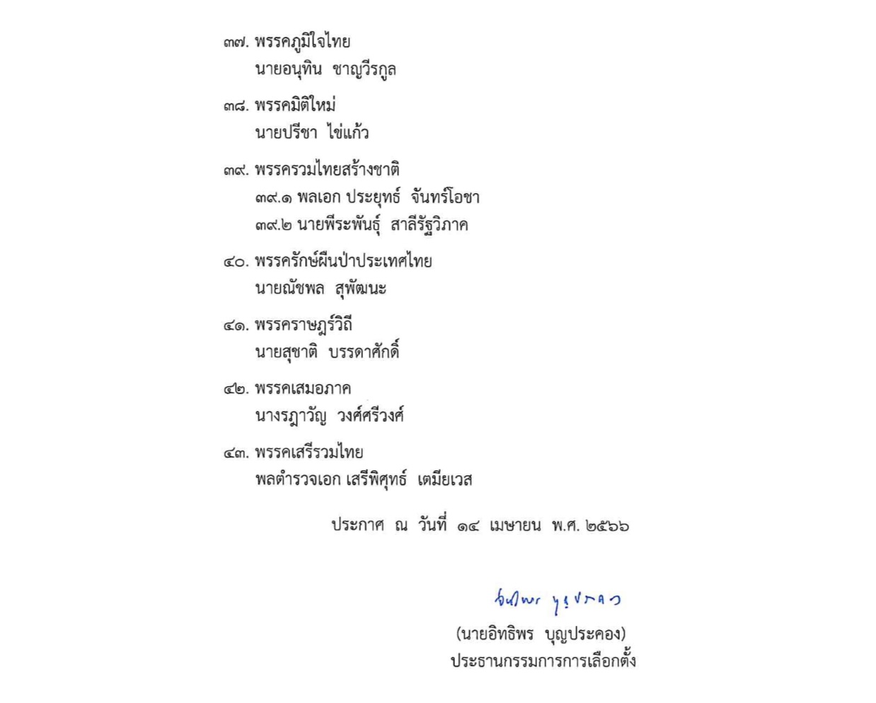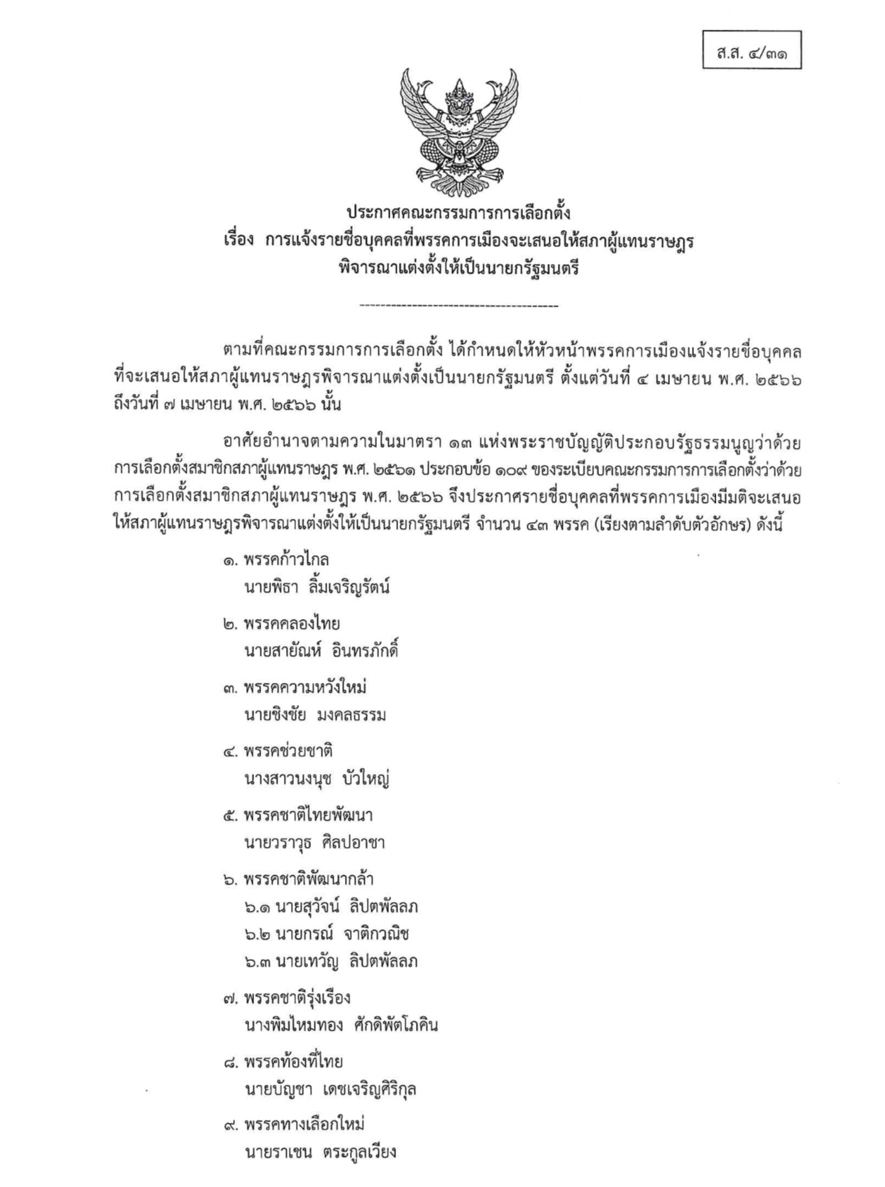 ดาวน์โหลดต้นฉบับ : ประกาศรายชื่อบุคคลที่พรรคการเมืองจะเสนอให้สภาผู้แทนราษฎรพิจารณาแต่งตั้งให้เป็นนายกรัฐมนตรี
