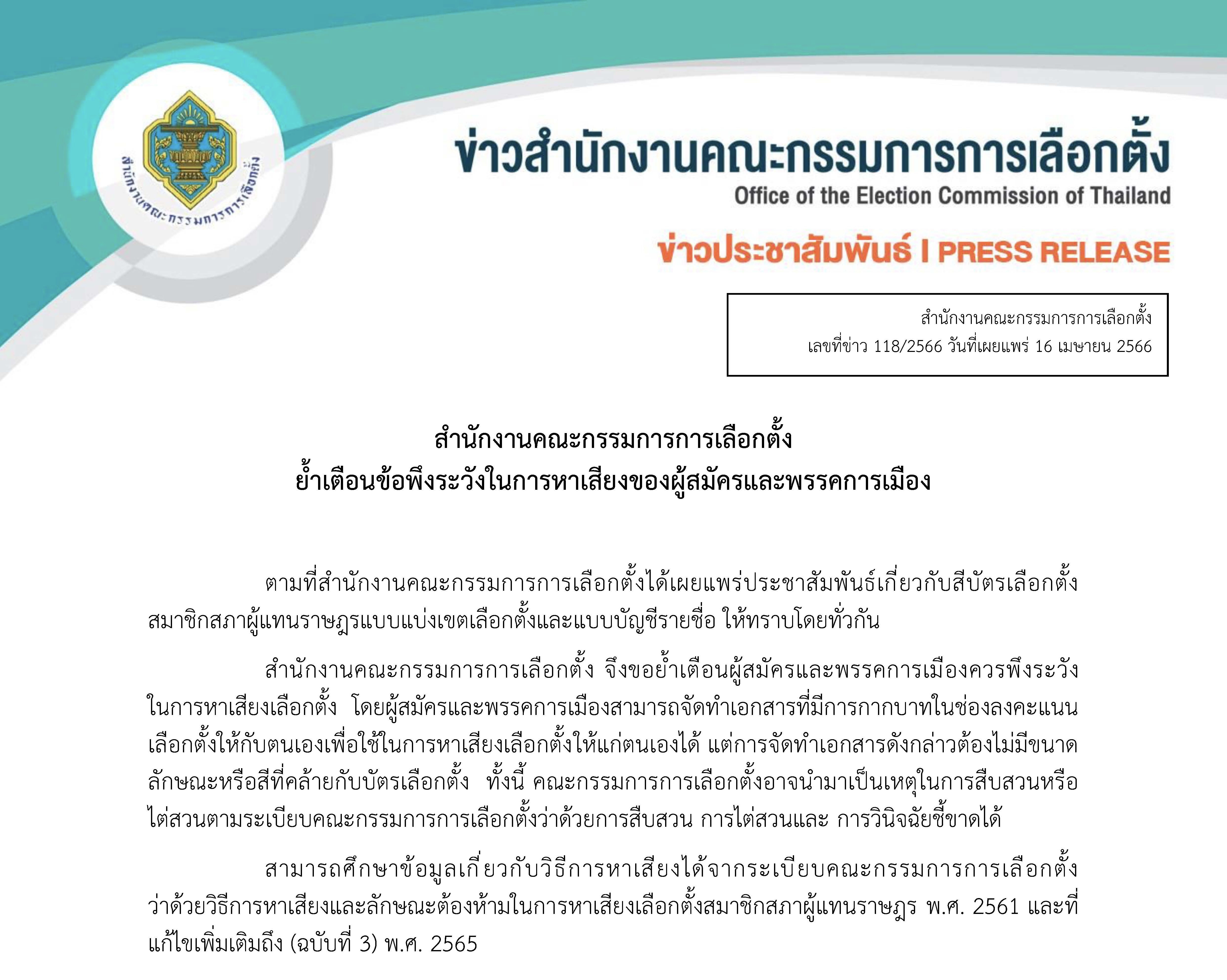 เมื่อวันที่ 16 เมษายน 2566 สำนักงานคณะกรรมการการเลือกตั้ง ย้ำเตือนข้อพึงระวังในการหาเสียงของผู้สมัครและพรรคการเมือง