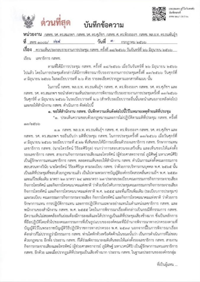 ผู้สื่อข่าวรายงานว่า เมื่อวันที่ 3 กรกฎาคม 2566 กรรมการ กสทช. 4 คน ได้แก่ พล.อ.ท.ดร.ธนพันธุ์ หร่ายเจริญ ,รศ.ดร.พิรงรอง รามสูต ,รศ.ดร.ศุภัช ศุภชลาศัย และ รศ.ดร.สมภพ ภูริวิกรัยพงศ์ ส่งหนังสือด่วนที่สุด ที่ สทช.1006/129 เรื่อง ‘ความเห็นประกอบการรายงานการประชุม กสทช. ครั้งที่ 14/2566 วันจันทร์ที่ 26 มิ.ย.2566’ ถึงเลขาธิการ กสทช. โดยมีเนื้อหา ดังนี้