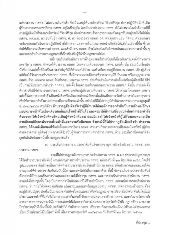 สืบเนื่องจากกรณีที่เมื่อวันที่ 26 มิถุนายน 2566 ที่ประชุมคณะกรรมการกิจการกระจายเสียง กิจการโทรทัศน์ และกิจการโทรคมนาคมแห่งชาติ (กสทช.) ครั้งที่ 14/2566 ได้พิจารณารับรองมติที่ประชุม กสทช. ครั้งที่ 13/2566 เมื่อวันที่ 9 มิถุนายน 2566 กรณีเห็นชอบให้เปลี่ยนตัว รักษาการแทน เลขาธิการ กสทช. (ไตรรัตน์ วิริยะศิริกุล) จนกว่าการสอบสวนจะเสร็จสิ้น