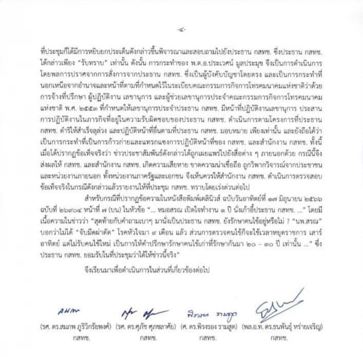 ทั้งนี้ เมื่อคราวประชุมครั้งที่ 14/2566 วันจันทร์ที่ 26 มิถุนายน 2566 ที่ประชุม ที่ประชุมก็ได้มีการหยิบยกประเด็นดังกล่าวขึ้นพิจารณาและสอบถามไปยังประธาน กสทช. ซึ่งประธาน กสทช. ได้กล่าวเพียง “รับทราบ” เท่านั้น